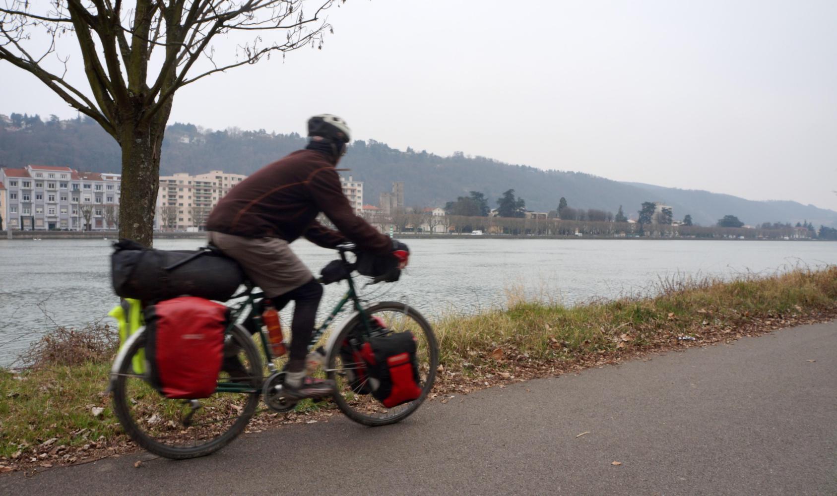 Well I'm on the road this morning feeling pretty rough, planning on riding out of the city on the right-bank of the river; but first I've to get to Confluencia, where the Saone converses with the Rhone; as, the riverbank street from the old town on this side is a one-way system toward me. I follow the lined off cycle-route over a bridge and along the other side contrary to the straightforwardness of my plan. Then on reaching Confluencia with a big futuristic glass-building museum, I follow the cycle-route further over the Rhone assuming this way will lead south out of the city.