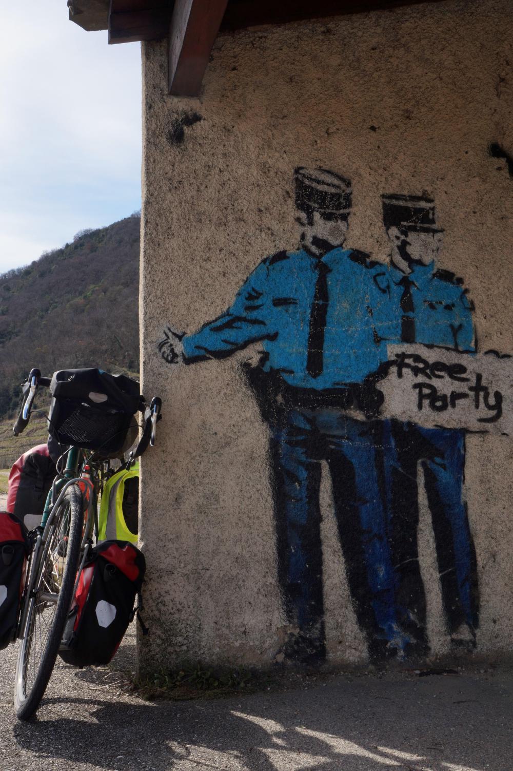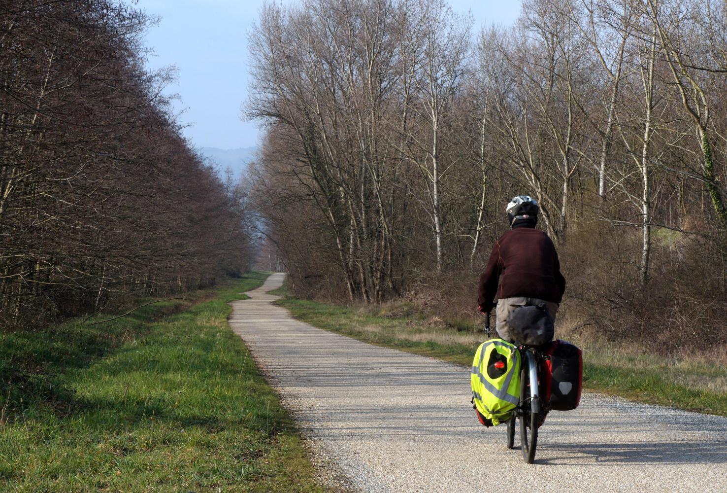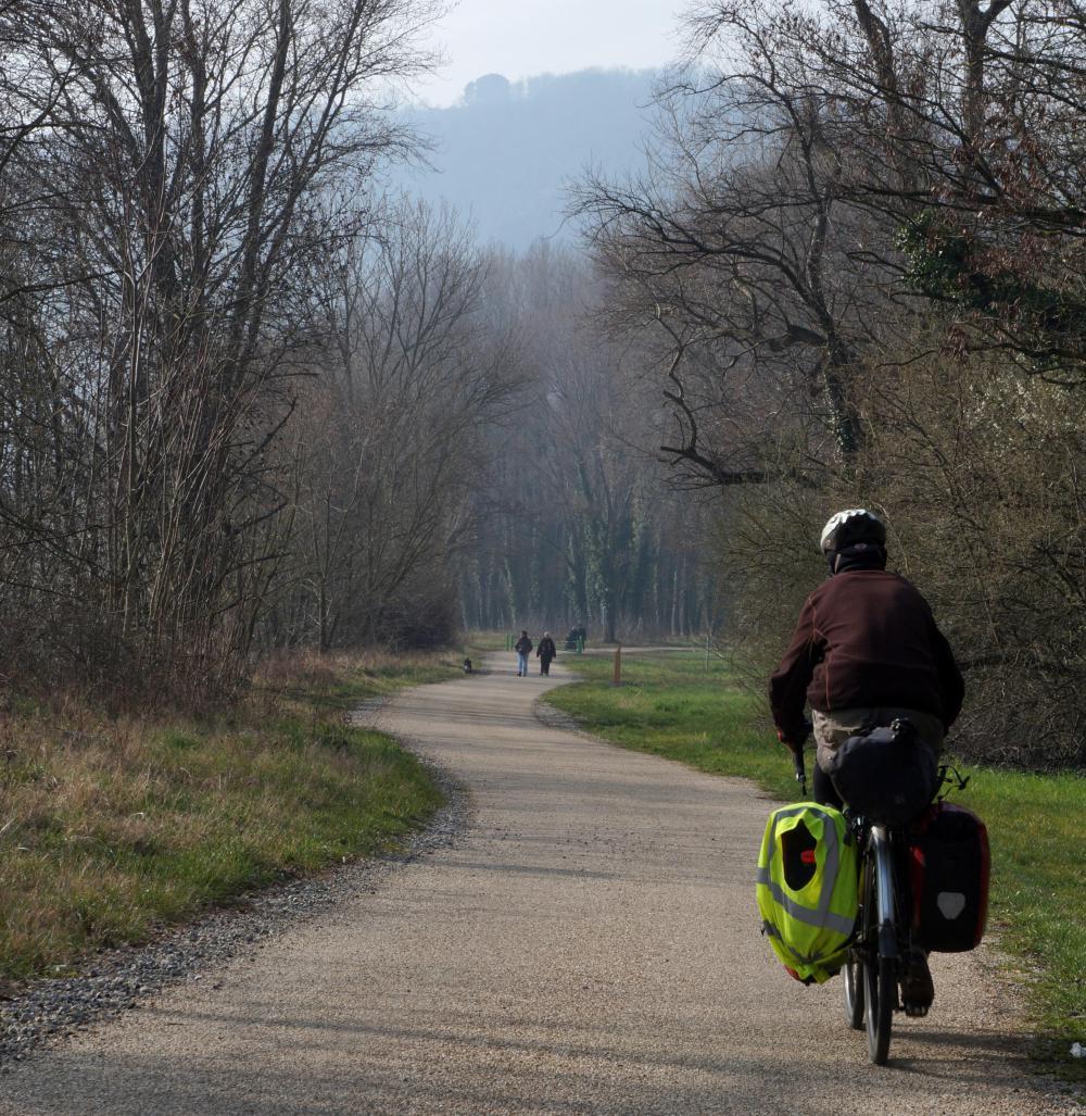 I stop at Lidl around midday before the Sunday afternoon shutdown. And as the day wears on my worn feeling turns to tire-ness. Perhaps it's not having drunk those beers last night, but the result of being up until after midnight every night while in Lyon, then up again at seven next morning, to journal and do the other things necessary when not actually cycling on a cycle-tour. For most of the afternoon I'm on the riverside cycle-path. There are lots of other cyclists it being Sunday, including a group I call "Club Wobbly Wheelers" Young men in a mix of lycra and street clothes on a Sunday jaunt in a slow wobbly formation; chatting and laughing. One that speaks English asks where I'm from. "Ireland", I reply. "Do-bline?" he then asks.