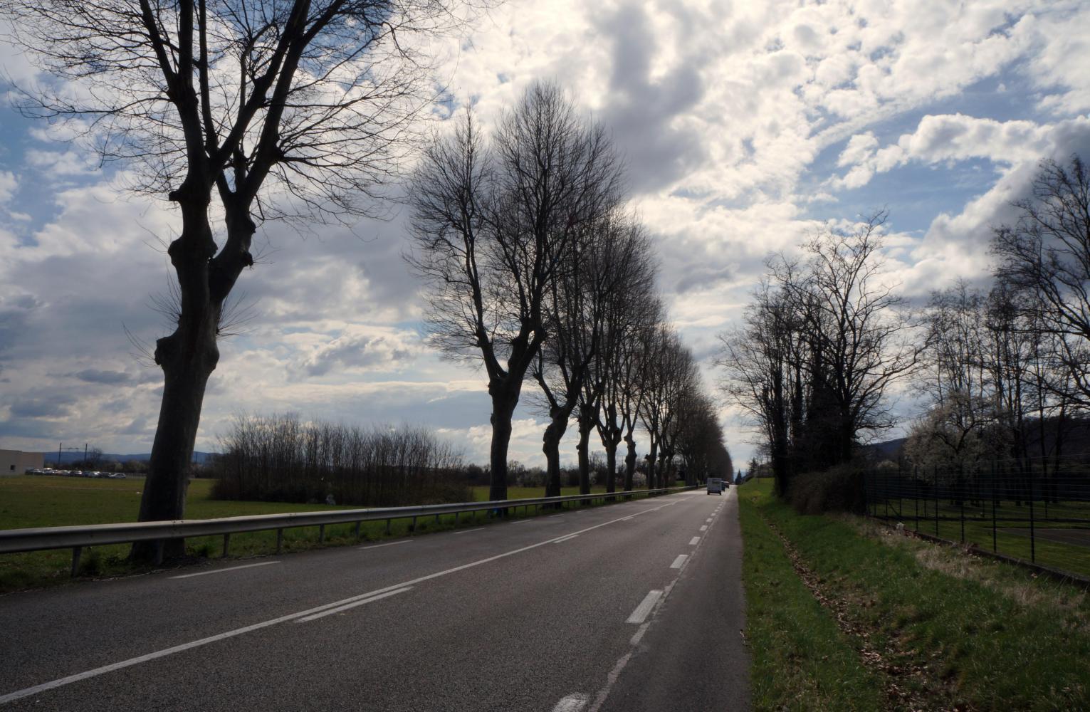 Onward the D86 looks to no longer be going the same way I'm going, and after checking the map, I decide to leave it. It continues onward south toward Nimes and I turn east, crossing the Rhone at Pont de Espirit, and follow D994 to Bygone, taking D8 to Carpentras therein. The rest of the day is on fairly heavily traffic road; straight and narrow through thick trunked avenues of beech trees.
