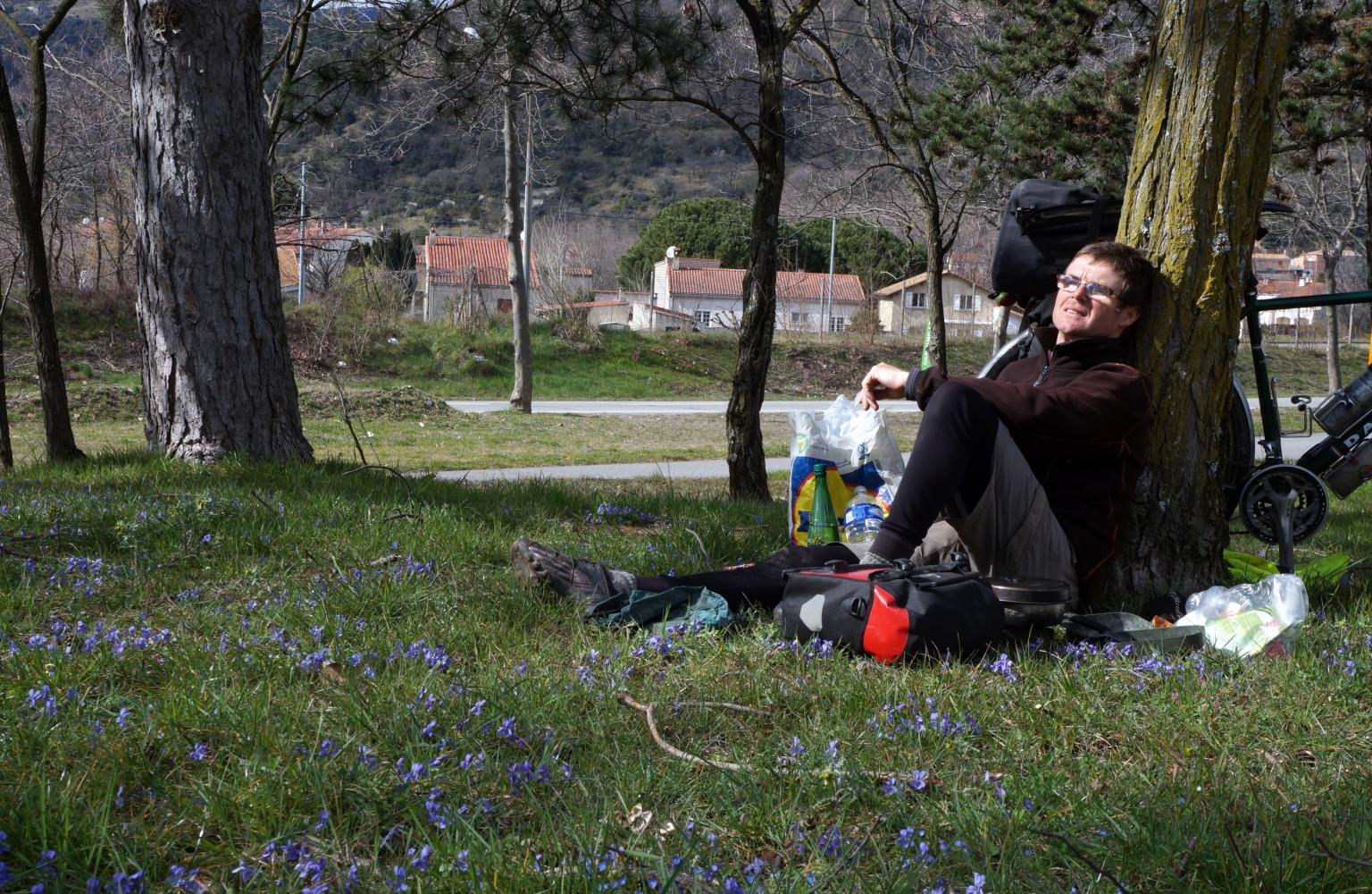 Once I've packed all my shopping outside the hypermarket, it is after one, but I ride on without eating for at least another hour, seeing an orange blob ahead, then catching a slow cyclist in orange hi-vis vest on a sit-upright bike which I pass without speaking and just then see the perfect picnic spot on the other side. I cross over and up a bank to a grassy carpet of blue spring blossom and trees to sit underneath.