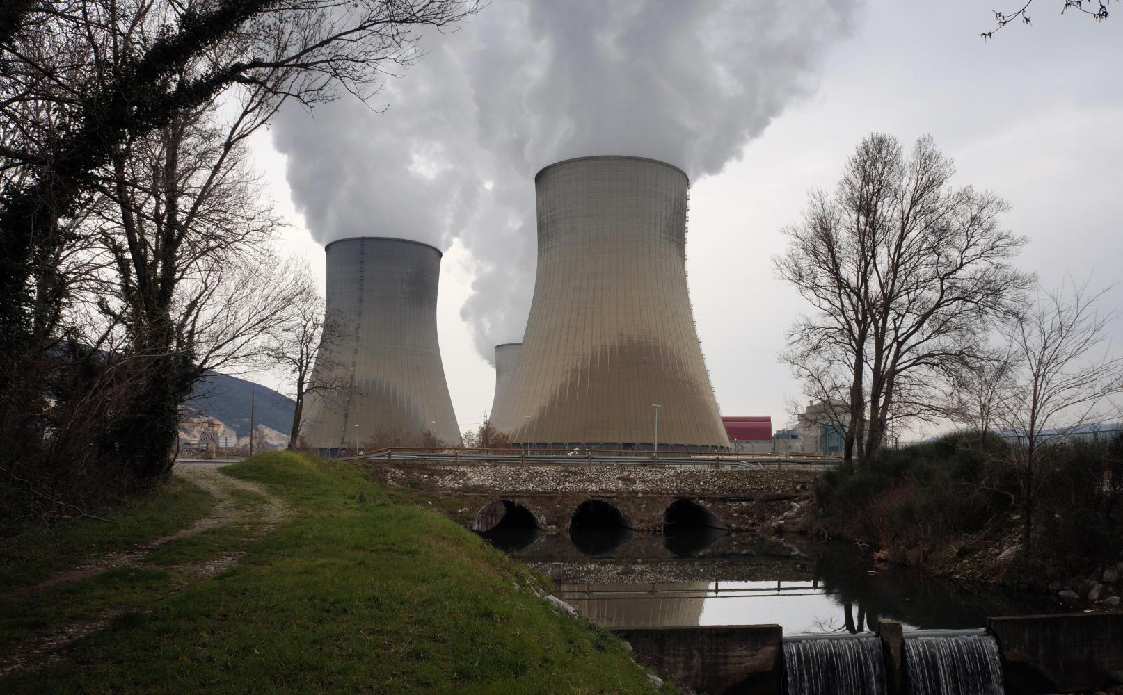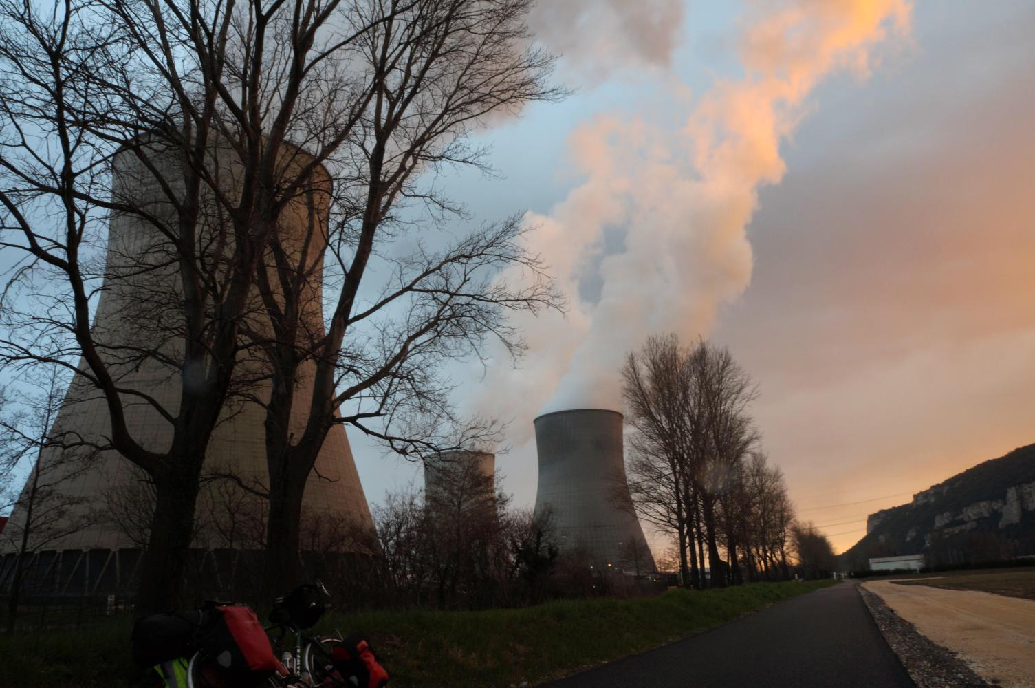 I round the hill and the next place Cruas, I reach as it grows late, is little more than a village sandwiched between a cement factory to the north on the way in and cooling-towers to the south, in the view of sight at the end of the narrow thoroughfare through whiffing up that column seen earlier. Here I turn left and pick up Via-Rhone which goes alongside the power station boundary fence just as late sun glints on the top rims of the towers and colouring the steam crimson. A good point in the day to reach this far as the low light suits taking photos. Though big spots of rain come in quickly from the north west and I hurry to put the camera away and ride on. But it is only a skiff and an orange rainbow arcs. Inside the boundary fence is an office block and car park half full of cars; toys on the floor with the giant structures looming around. And outside is another car park with a dozen campervans pulled in for the evening; on the other side of which, is a parkland strip along D86. I look to camp in here, but it is a little muddy. I follow the cycle-route further and turn the corner of the power plant, where there's a water channel off to the right with a firm grassy track alongside and enclosed in an avenue of trees. Perfect camping.