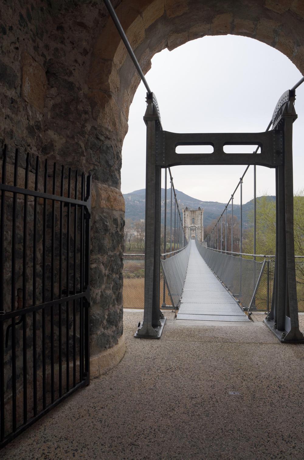 Via-Rhona south goes tight along the river on top of a flood defences, making me think that the mighty Rhone must've posed a real flooding treat before it was contained by this thick earthen embankment. Further I cross a bridge onto an island. An old suspension bridge with two stone built towers reinforced with iron perhaps two-hundred years old, but the original suspended walkway, likely ropes and planks has been replaced with modern steel cable and metal walkway.
