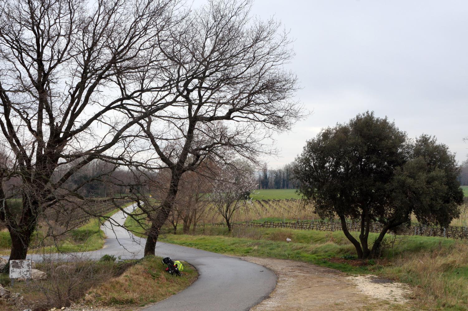 Later I write on entering Provence: yes, boring rows of bare sticks (the grape vines) stretching towards blue-grey humps and ridges of the Aples and since early afternoon the snowy top of Monte Ventoux peeks through dark blue gloom with occasional drops of rain towards dusk. I find the only possible campsite two hundred metres off the road along a hedge, the only bush or tree for a long time, providing a degree of cover. I eat, floss my teeth, write my notes, then lay down and read The Old Patagonian Express, but shortly doze off. Later waking with terrible stomach cramp, laying awake most of the night thereafter feeling like some-one is standing on my adominen and puzzled to the reason why.