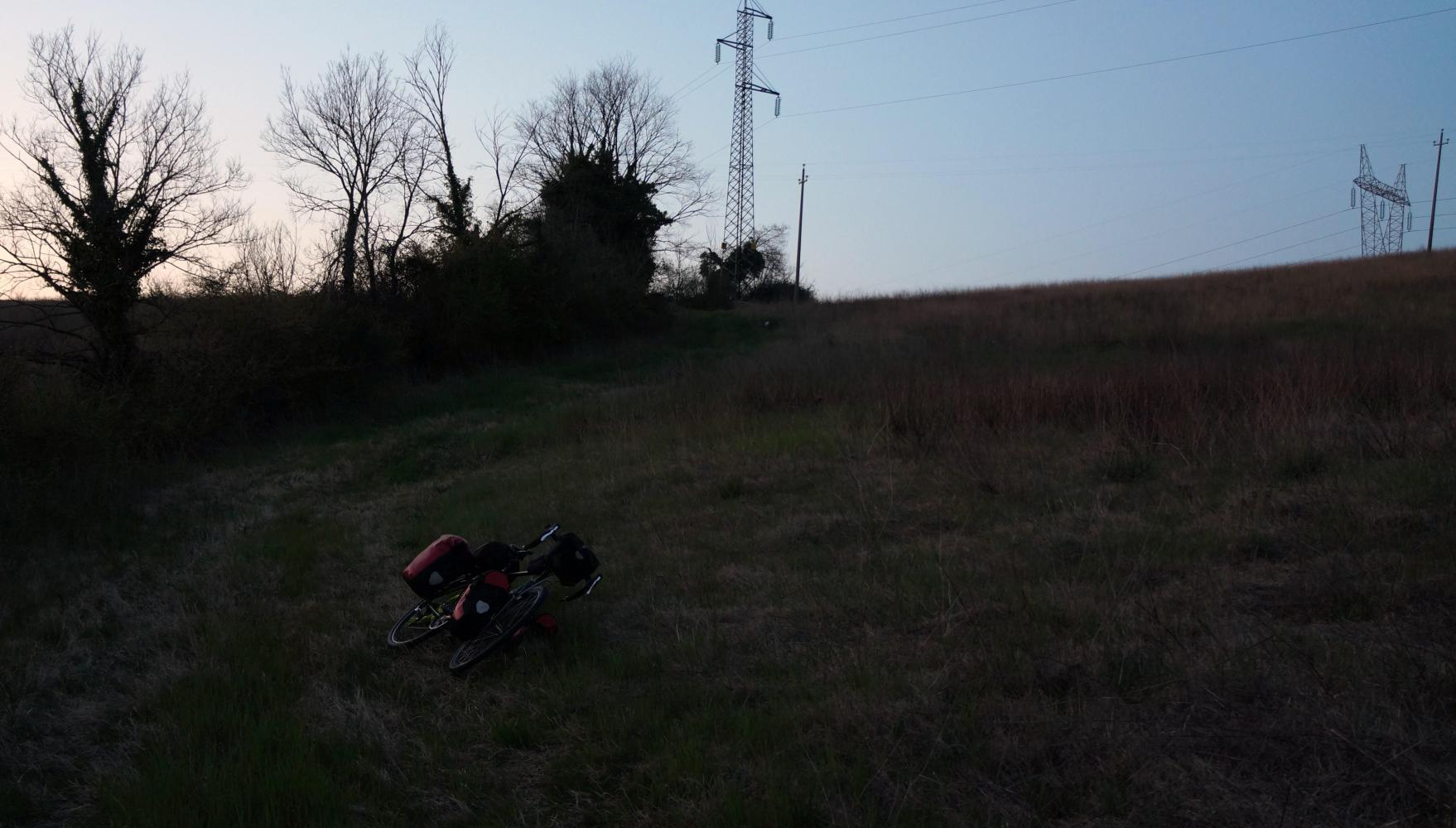 After a third ascent of the day to the walled citadel, Todi, it's getting late and the modern town sprawls out for many kilometres along my chosen road onward to Terni, which ends at a big interchange roundabout and autostada. There is a small road on, signpost to a village three kilometres away. From this village there's a sign on for Terni and a narrow rolling road across open farmland ahead. A sigh of relieve but not for long as beyond the crest of the first rise, where there is a copse of trees and I think campsite, I discover a house beside those trees. And the countryside on and on has houses just about on every rise or unproductive land. Then there's two villages to pass through. I am riding with my lights on by the time I reach a rough unused field without human habitation nearby.