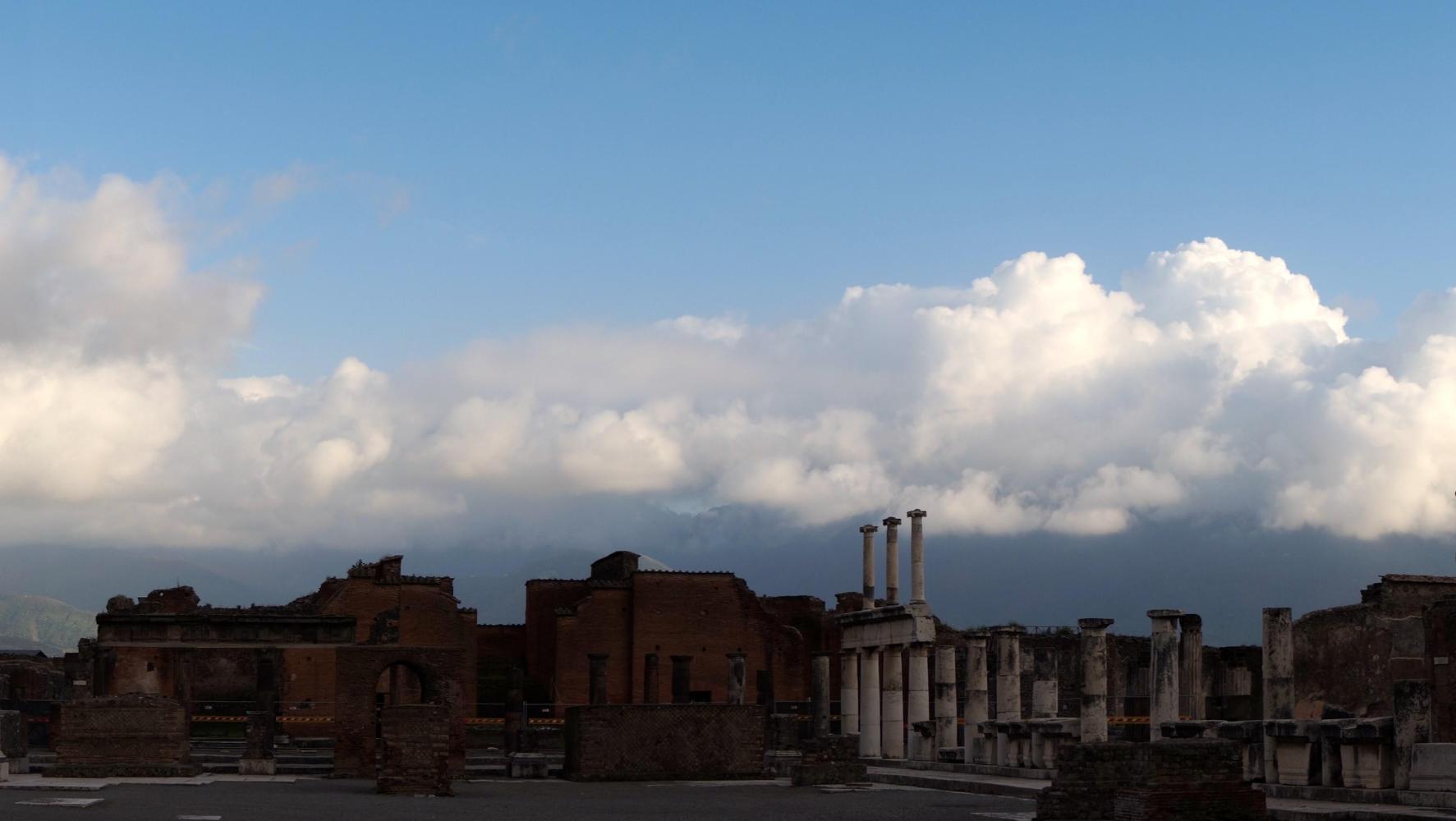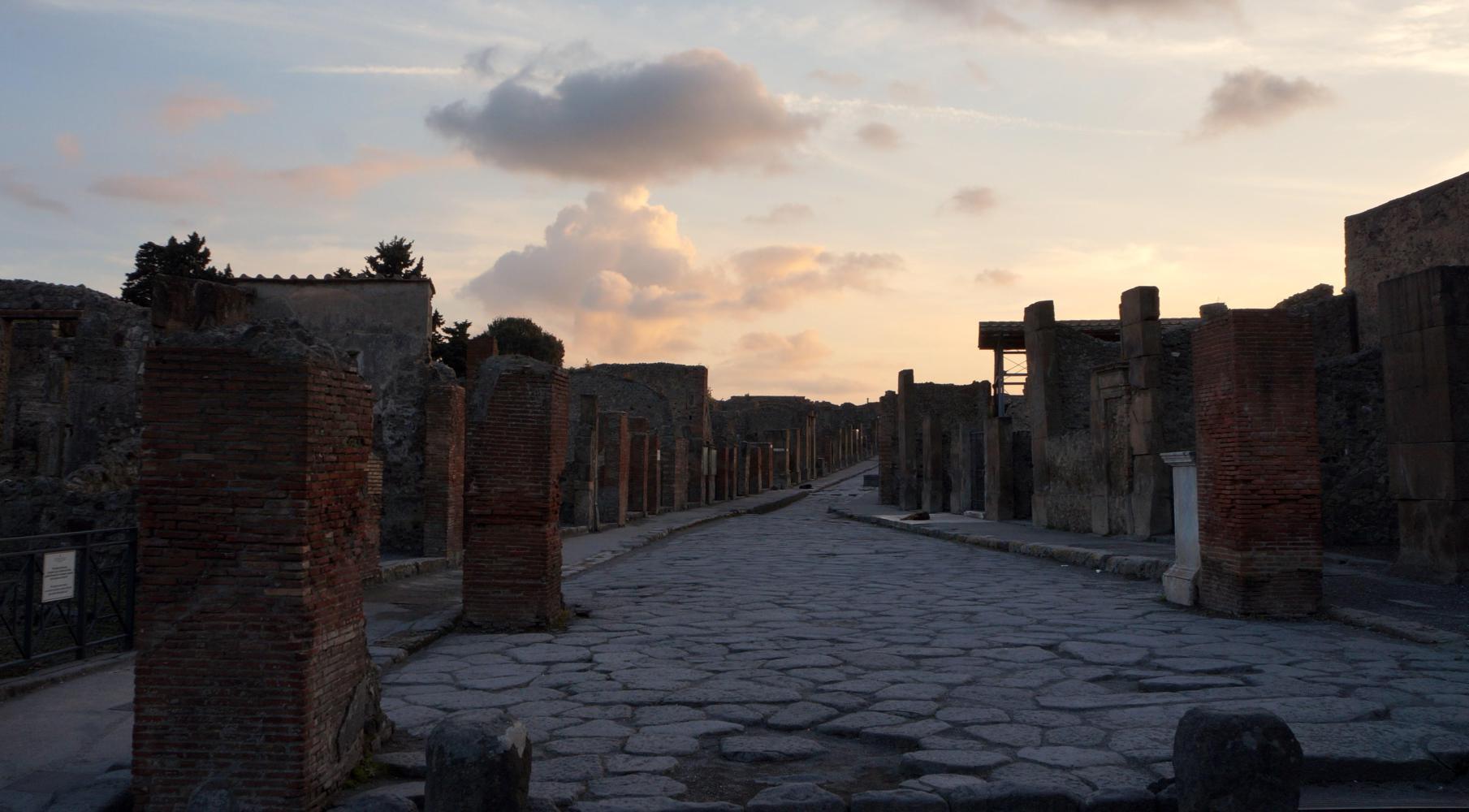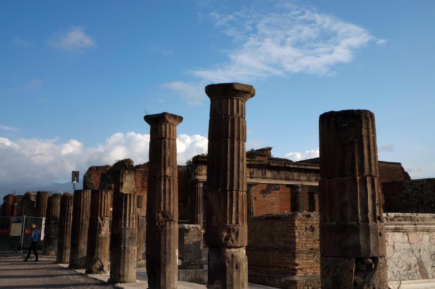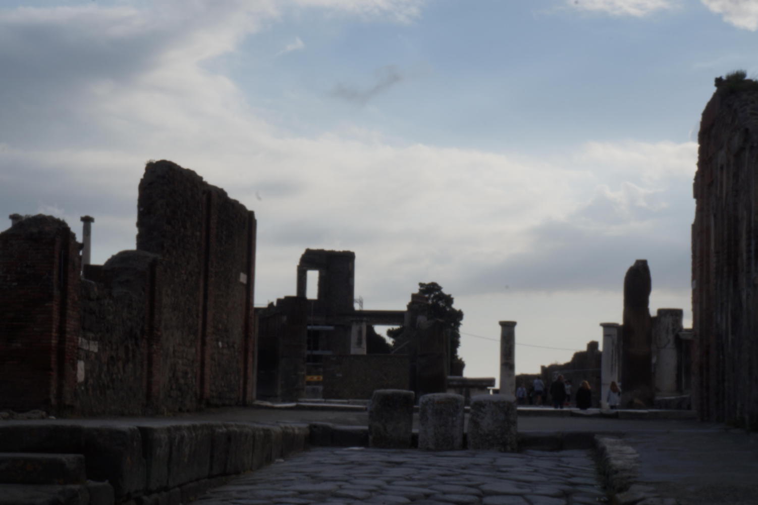 The previous time here, it was just before noon, the sun blinding overhead and therefore a complete waste of time taking pictures. Today the light would be subtle. About half five or it could've been six, the sky goes a mystical yellow over the ruins, the cloud has broken up revealing the sun hovering toward the west and later contrasting golden rays with deep blue and graceful puffs of clouds in brilliant afterglow over eerie environs of what remains of a city. The walls of houses, the roofs gone, arranged along a grid of flagstone paved streets with raised sidewalks; and pillar columns standing in rows, supporting nothing, standing stark against twilight sky, what remains standing of temples along a large piazza, all empty except for the echoing chatter from a large group of Italian school children somewhere near.