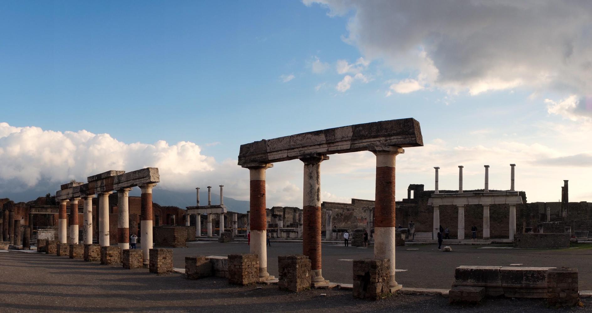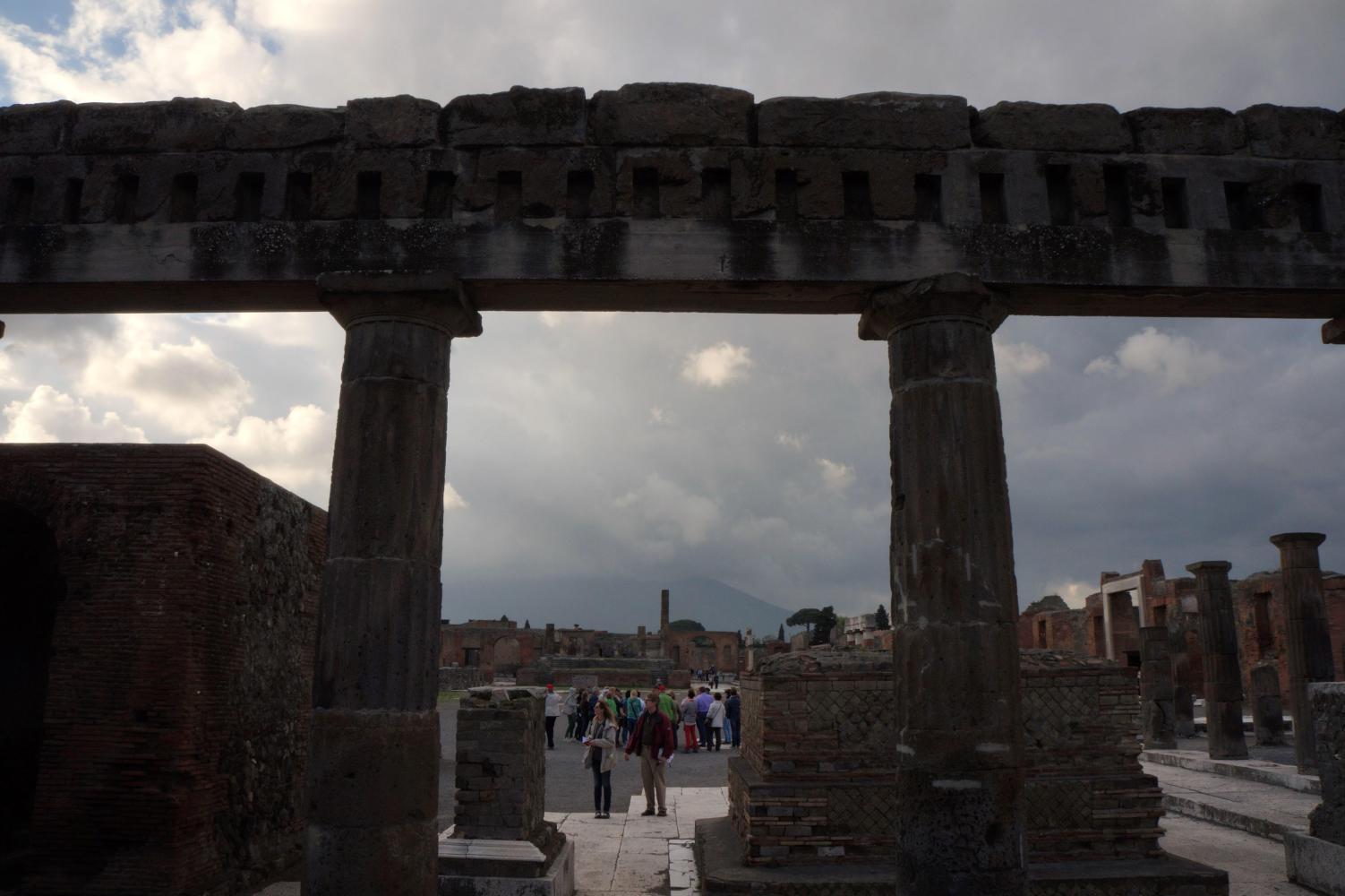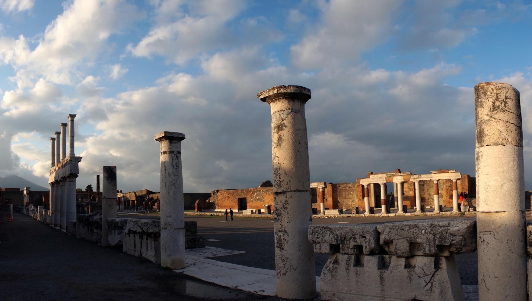 The previous time here, it was just before noon, the sun blinding overhead and therefore a complete waste of time taking pictures. Today the light would be subtle. About half five or it could've been six, the sky goes a mystical yellow over the ruins, the cloud has broken up revealing the sun hovering toward the west and later contrasting golden rays with deep blue and graceful puffs of clouds in brilliant afterglow over eerie environs of what remains of a city. The walls of houses, the roofs gone, arranged along a grid of flagstone paved streets with raised sidewalks; and pillar columns standing in rows, supporting nothing, standing stark against twilight sky, what remains standing of temples along a large piazza, all empty except for the echoing chatter from a large group of Italian school children somewhere near.
