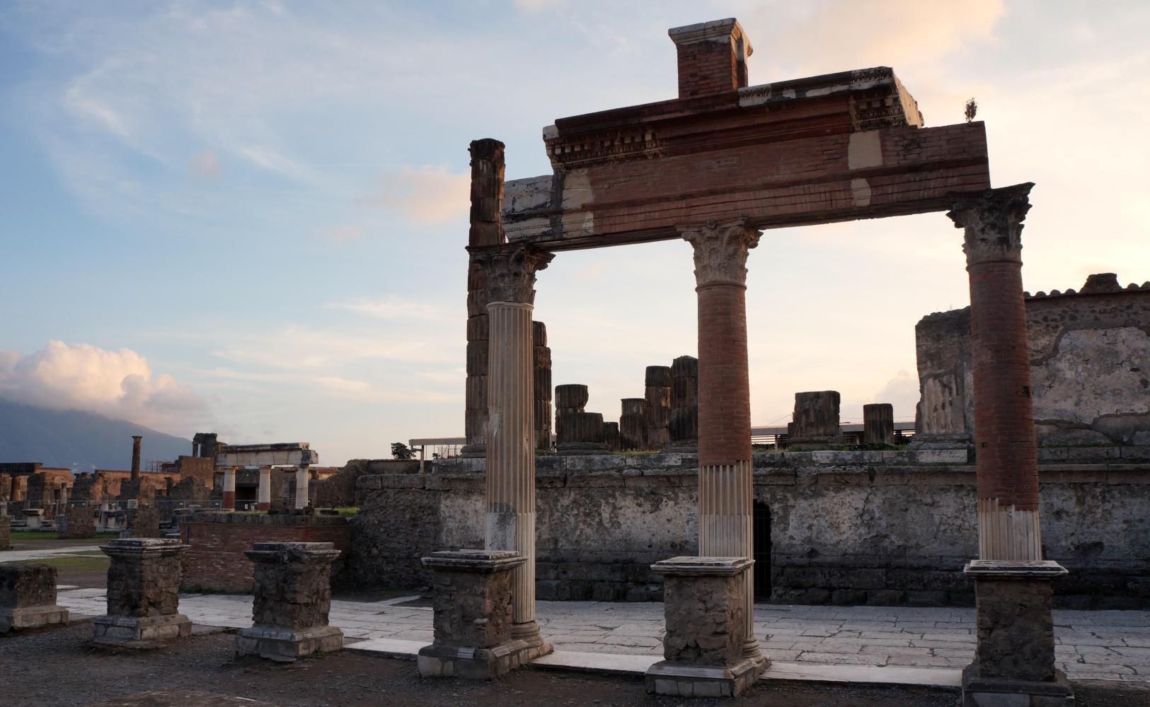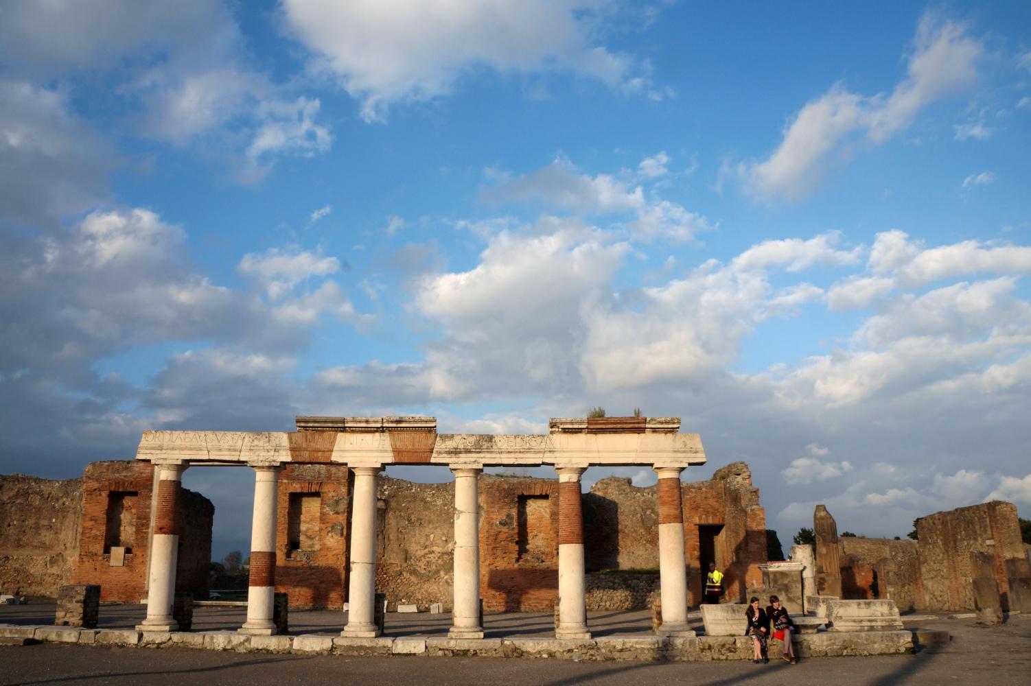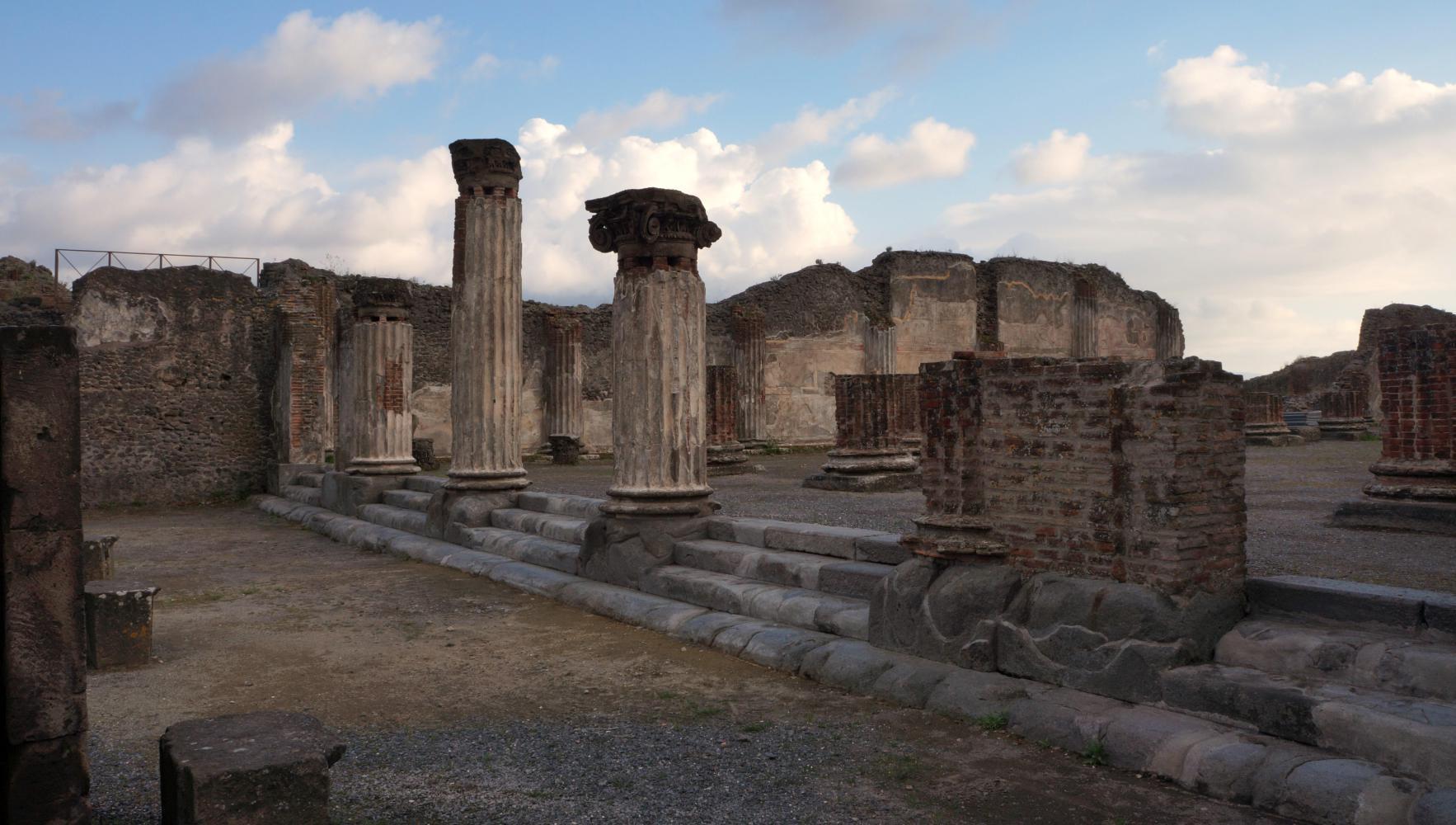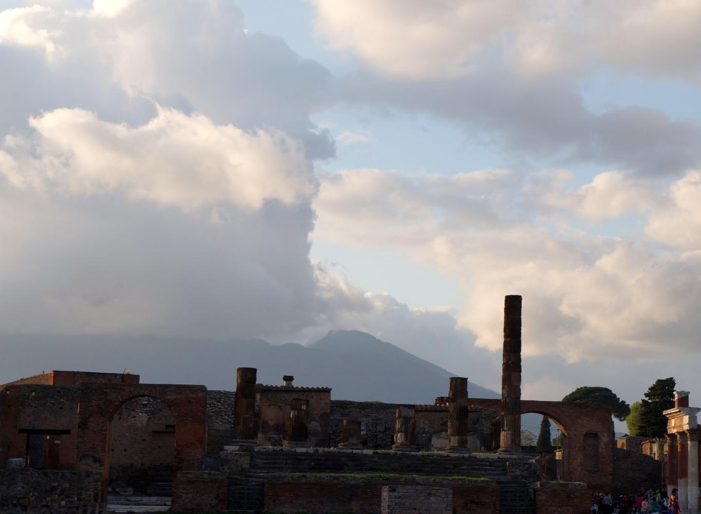 The previous time here, it was just before noon, the sun blinding overhead and therefore a complete waste of time taking pictures. Today the light would be subtle. About half five or it could've been six, the sky goes a mystical yellow over the ruins, the cloud has broken up revealing the sun hovering toward the west and later contrasting golden rays with deep blue and graceful puffs of clouds in brilliant afterglow over eerie environs of what remains of a city. The walls of houses, the roofs gone, arranged along a grid of flagstone paved streets with raised sidewalks; and pillar columns standing in rows, supporting nothing, standing stark against twilight sky, what remains standing of temples along a large piazza, all empty except for the echoing chatter from a large group of Italian school children somewhere near.