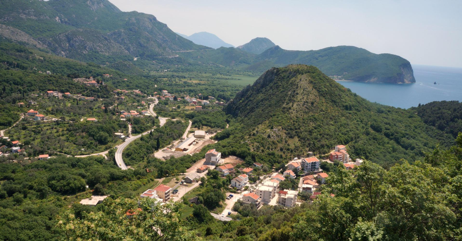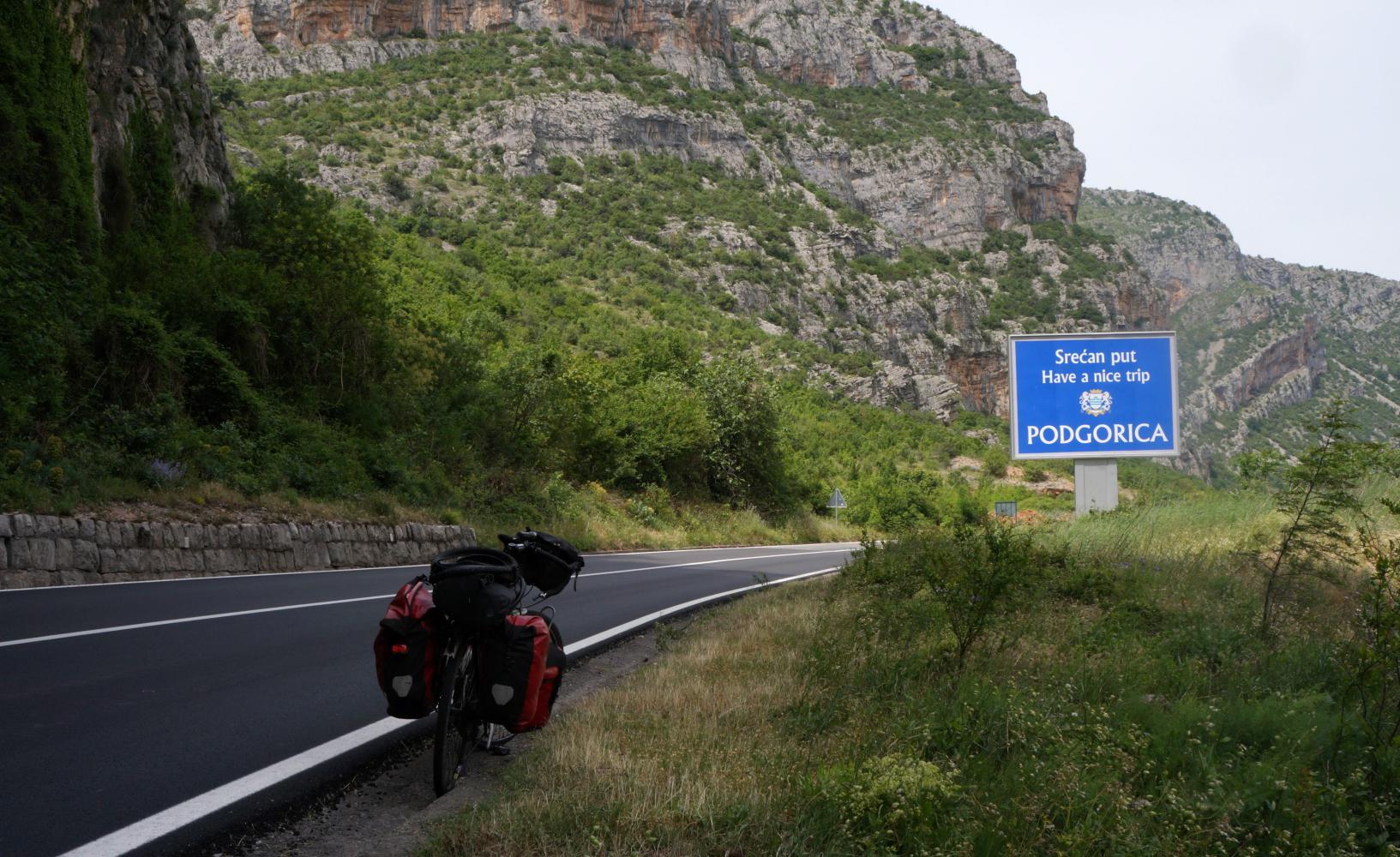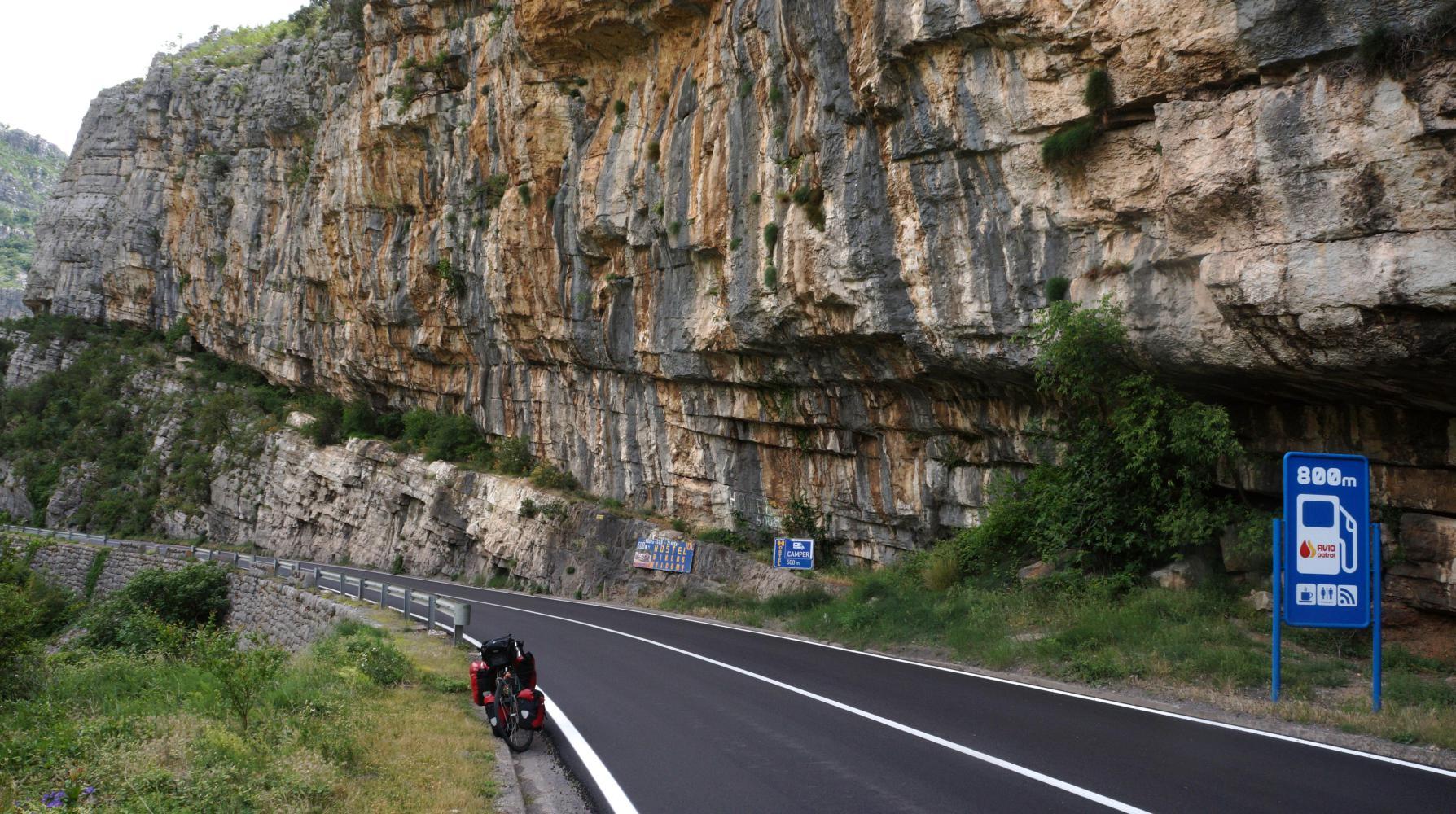 Soon there's a choice of roads to Podgorica, as another road splits off on the left and climbs round and over the coast road and up the hillside on the right. This is the short route and therefore the bulk of traffic turn off here; also, on the direct route, there's a sign indicating a long tunnel, making it unappealing. With less and more intermittent traffic I continue straight, through a short tunnel where the other road passes over and laboriously climb a steep rise, whereupon I meet a recumbent touring-cyclist whizzing freely down the other side. I wave and he return the wave with a broad smile upon his face.
