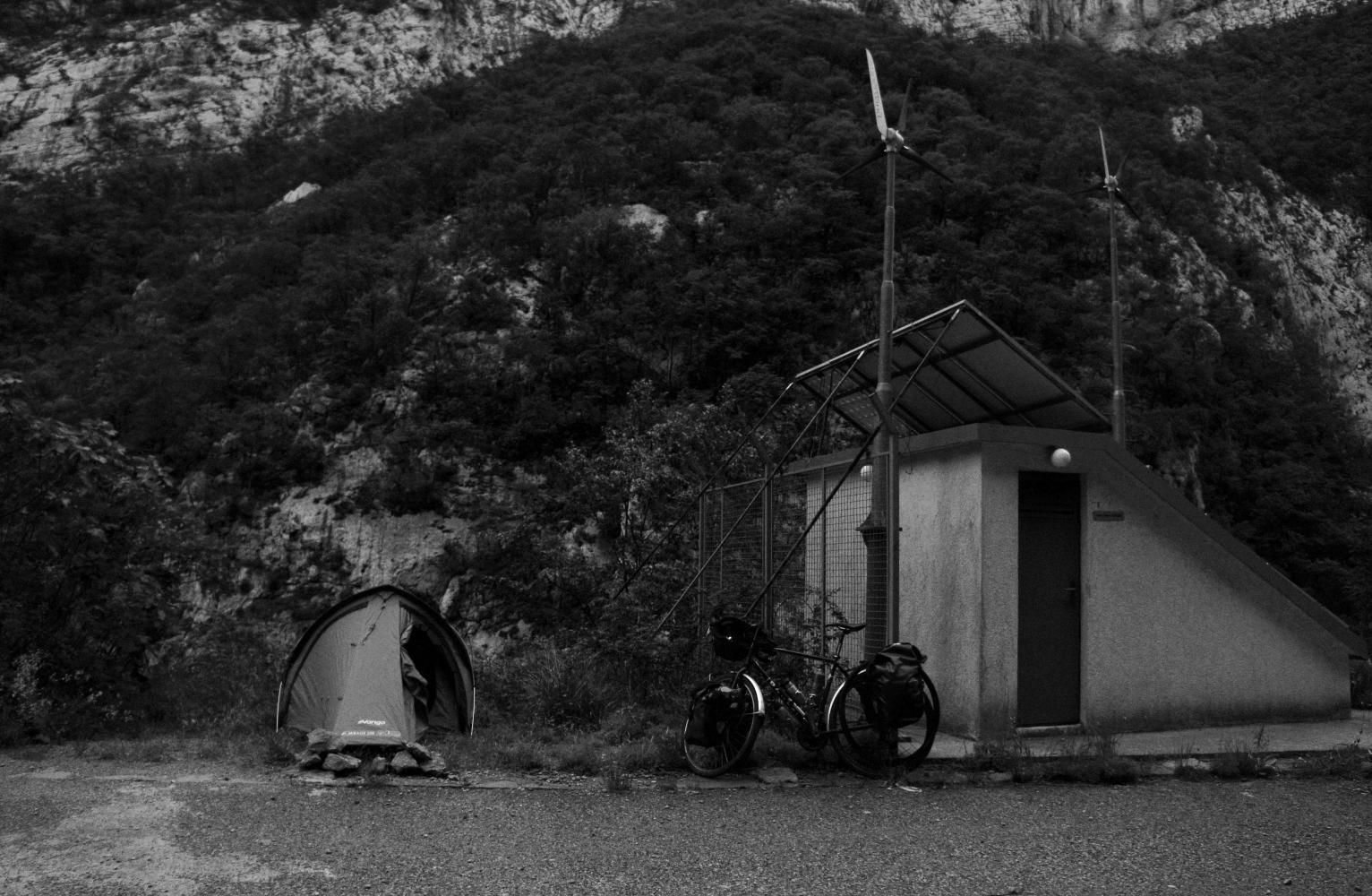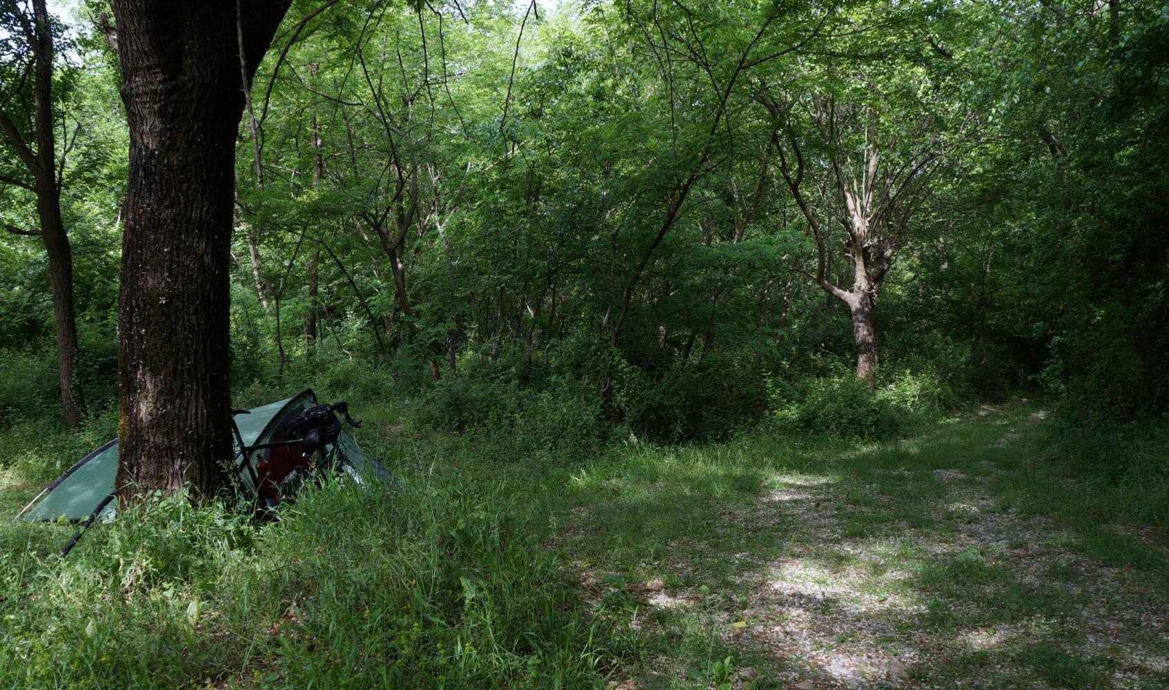 I return to about a hundred metres short of the road where I had passed a flat entrance to a small field, not exactly hidden from the road and lean the bike against a fence, take my book out and sit down to read, waiting until dusk before putting up the tent.