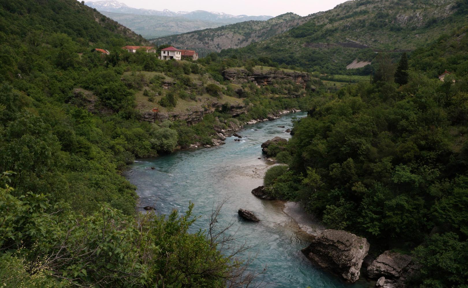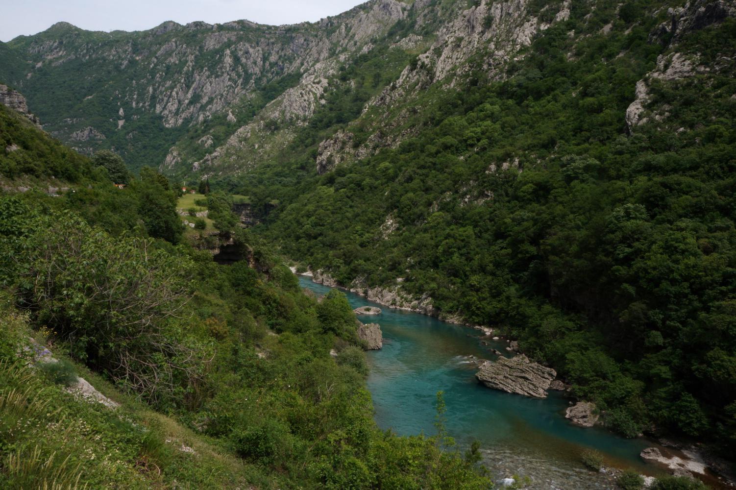 Having crested the final bit and come down a bit, I halt at the roadside and take in the view. Montenegro is province size. About Northern Ireland in area; but instead of rolling low hills, it is verdant green tree foliage up steep rising ground, fading to speckled green on grey rocky escarpment and razor ridge tops, like the scaly backbones of colossal reptiles.