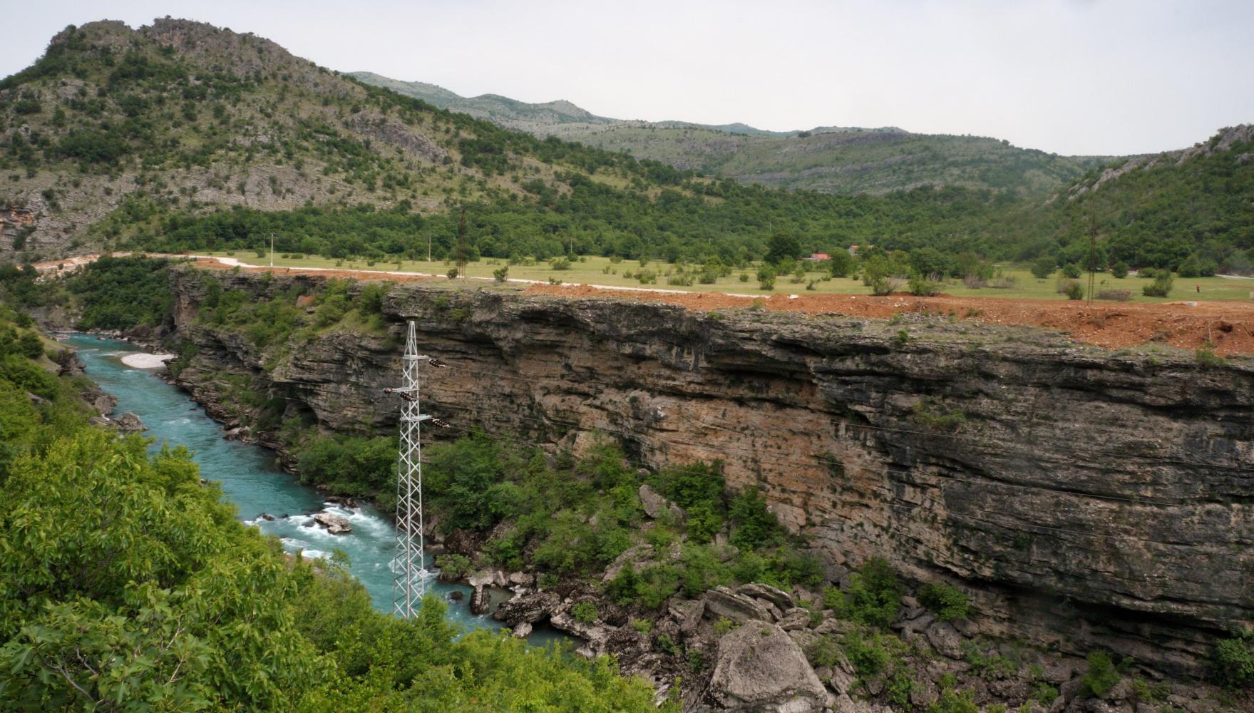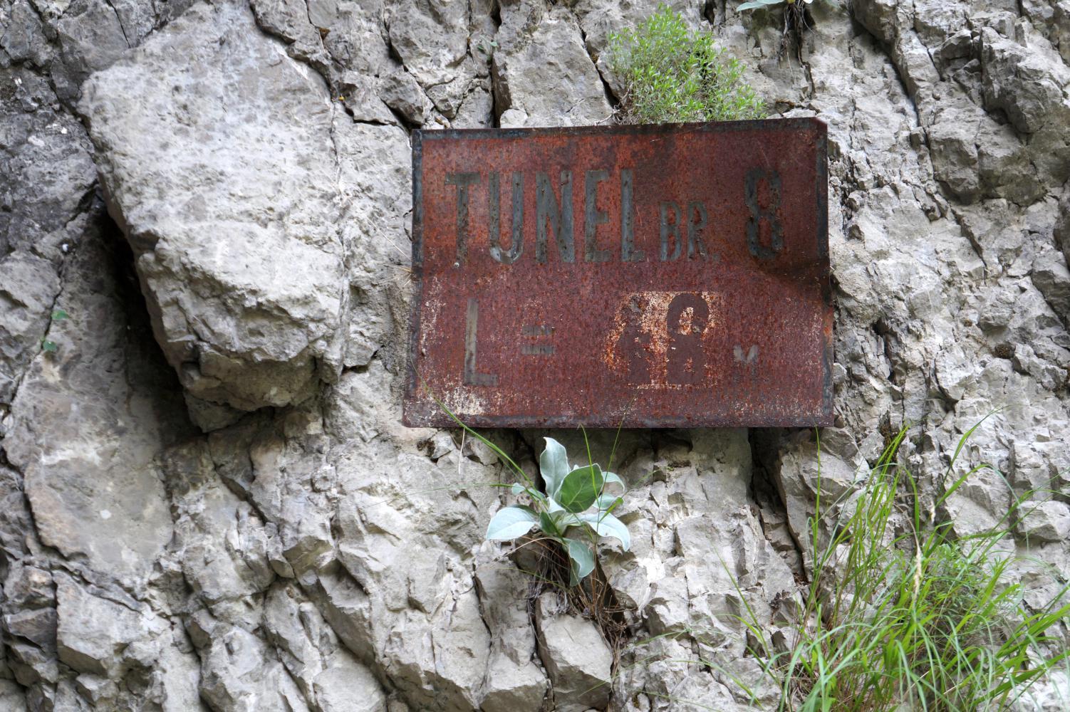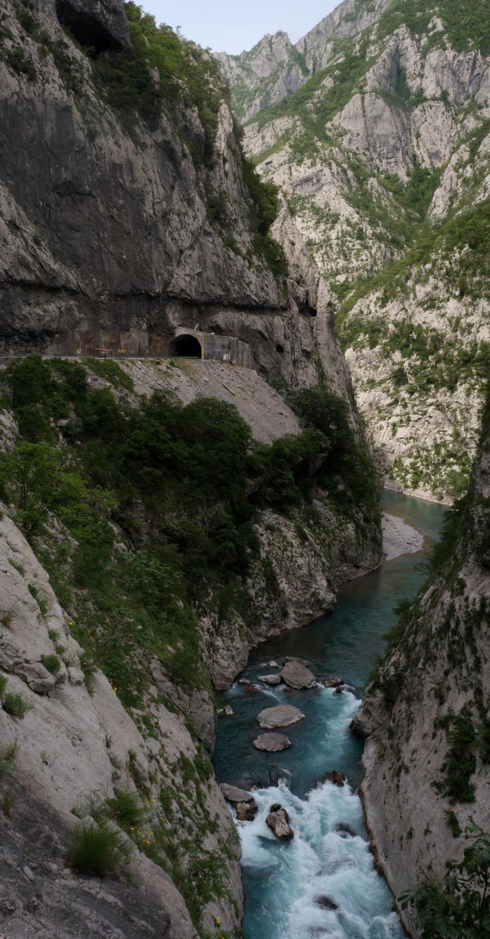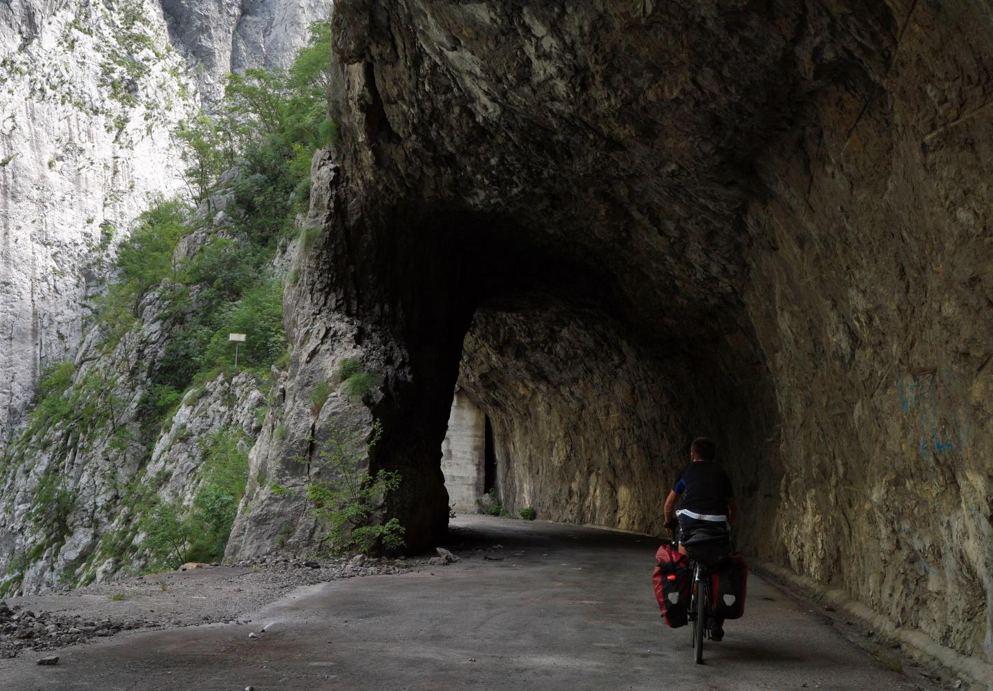 The road on toward Kolasin follows a tight valley with turquois and foamy white river surging along the bottom of a green bushy slope down on the right and rock strata on the left, which eventually morphs into a narrow deep canyon. The road becomes narrow and then I come to a long tunnel, but there's a bike-width margin on the inside though no lighting until I come to a shaft of daylight; which, upon reaching, find is a split off taking me out on an old road with a couple of short tunnel archways. The road before the present tunnel was built: an empty road, or ledge along the canyon with the tumble of the river way below.