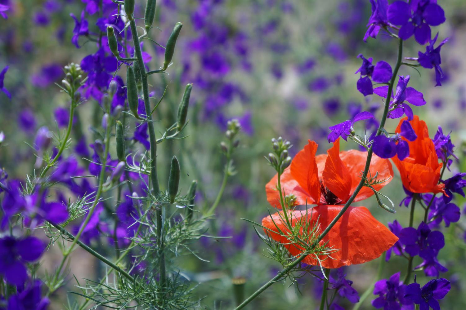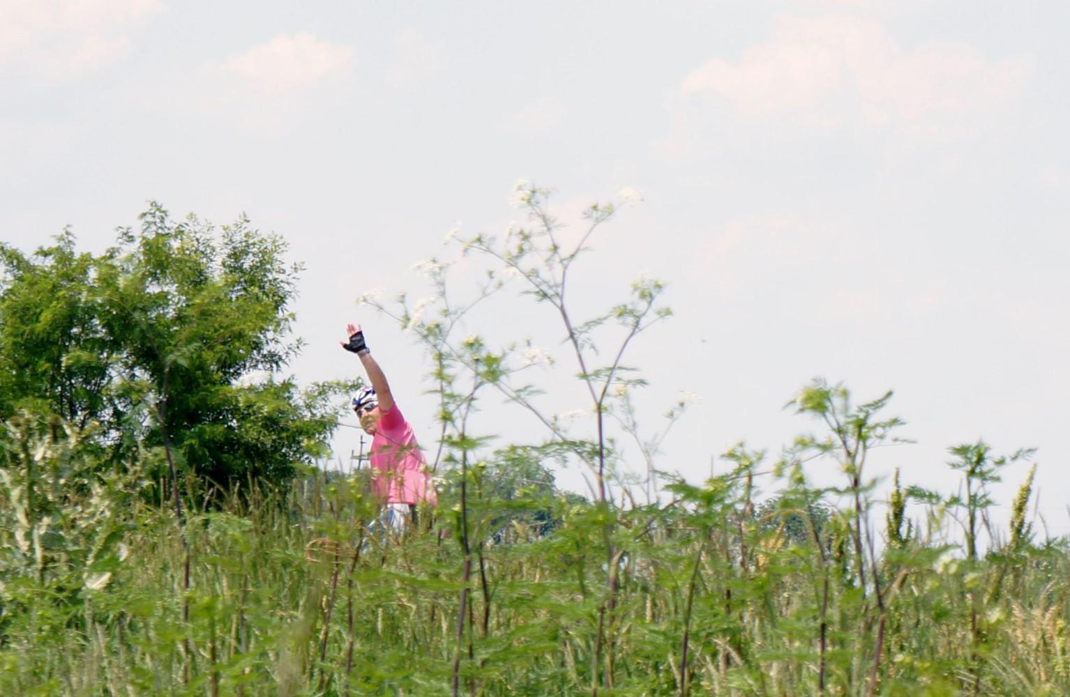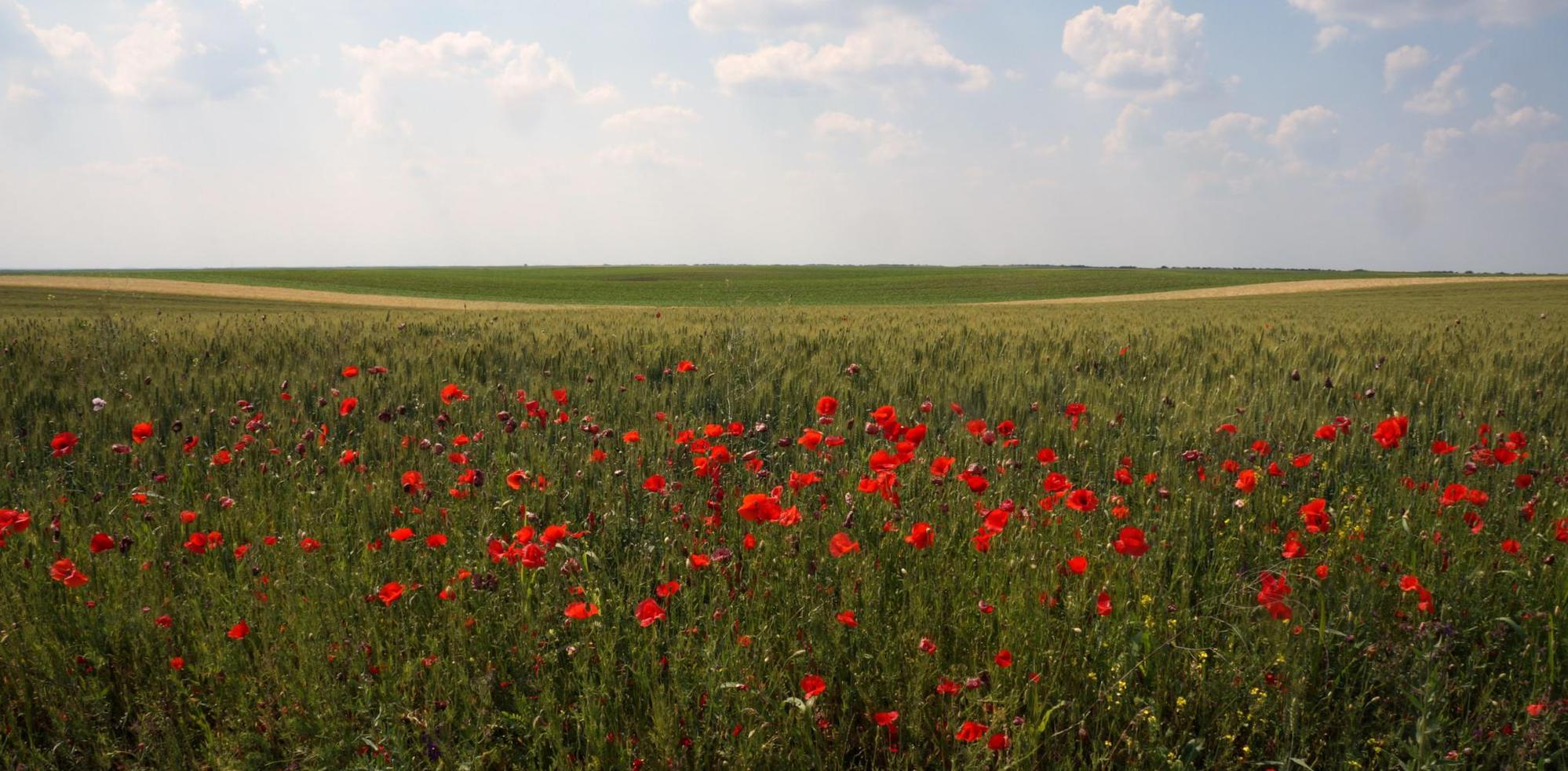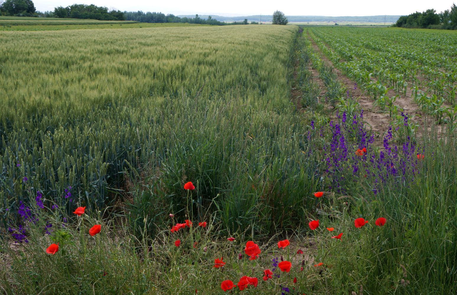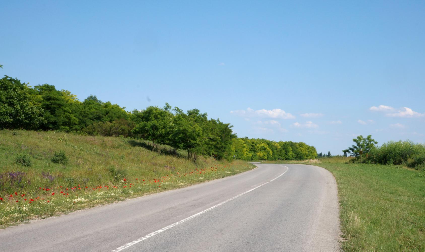 The way on is slow meandering with poppy sprinkled verges, little traffic and level with wheat and maize stretching off on either side. Off to the west I can see the low wooded hill beyond the Danube the road crossed yesterday. I pass through a couple more villages and in one I assume I must've taken a wrong turn. I don't discover this until quite a bit later. About two or it could've been later, I approach a rampart, a green bank-like low hill the whole way from left to right ahead of me and when the road reaches it, the road swings left and follows alongside for a few kilometres to a village, in the street of which there's some kind of festival going on. The way full of people having a day out. There's music and stalls selling clothes and this and that. I make my way through the throng as best I can. Then the road climbs up the said hill emerging up upon a plain plateau, again with colourful verge and expanse of crop either side. The road run straight ahead, then descends sharply to a small village on the same side of the long hill I climbed up earlier; whereupon, seeing ahead a string of power-lines on pylons, see they are the same I passed underneath earlier, I become aware that I'm going back on myself and that I'm no longer on the right road. But in the village two byroads meet another road, including the one I come downhill upon, and I kind of find my bearings after riding a little on before stopping and turning around, having realised that I should've turned left in the village, taking me on with the power-lines behind me. The road I've turned onto continues alongside the slope on the left and within a kilometre, the elongated hill turn a corner to the left, opening into a shallow valley. There is now a long low hill off on the right and I become doubtful I'm on the right road after all.