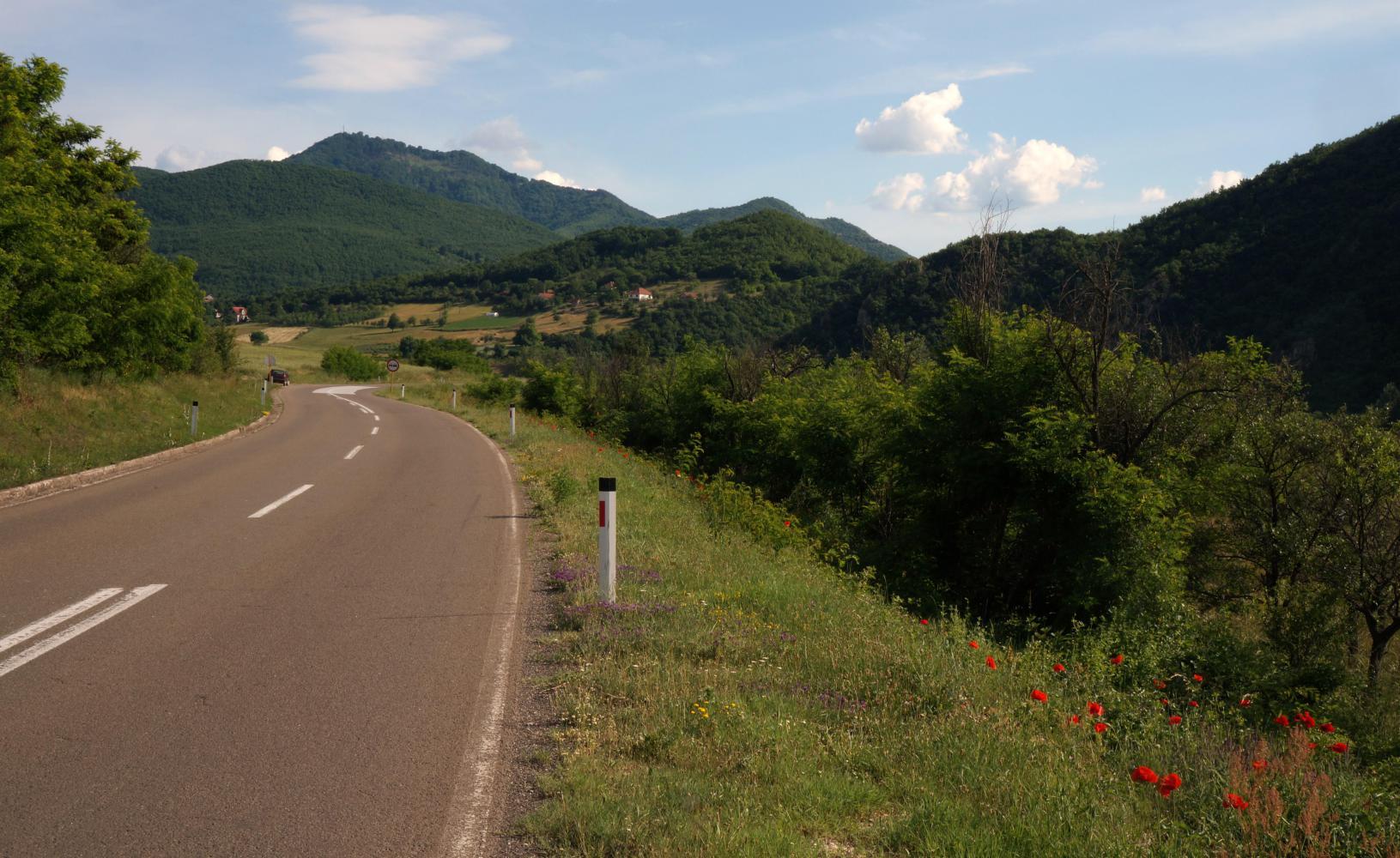 On from Krajevo the road is still numbered 22 and as alluded to earlier is going towards the mountains, though without much tough gradient. I'm getting into my stride today pedalling seemingly effortlessly at a nice smooth tempo while looking ahead at the road twist and turn it's way up the valley with a river below on the left, and small hayfields and steep pine covered slopes to the side.