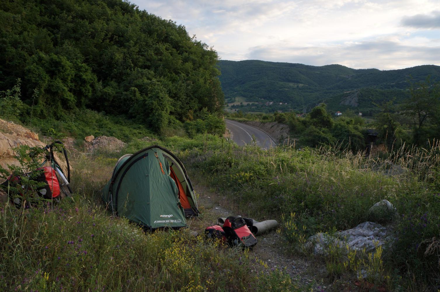 Coming up on six o'clock I'm cycling by a cutting and see that up on top of the cutting will make a good campsite. The tent is still damp from the last day I packed and a snail got trapped and has now decomposed, creating a horrible gooey mess inside the vent where it'd crawled in, which smells awful, like dead barnacles. I clean it off as best I can with a bone I pick up from the ground and rinse it with water from the water-bottle, then prop it up to dry in the sun and vow to check the tent better in future before packing.