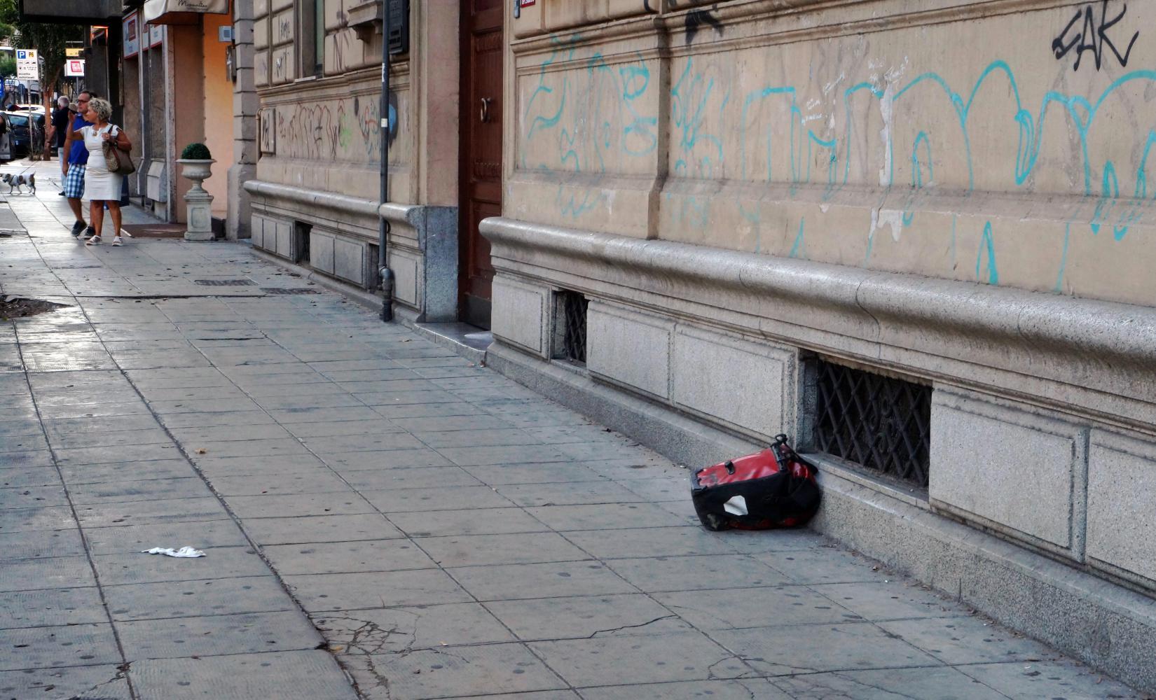I stop in the piazza down from the hostel to do so, leaning the bike against a wall and remove the rear left pannier for better access for the pump. Then once I've done, I ride on, making quick progress in the melee of cars and scooters. Outside the ticket office where I'll get my boarding pass, I pick the bike up, nothing more than to see how heavy it is; and notice it is a lot lighter than usual. Then, see the rear left pannier isn't there. I forgot to put it back on when I stopped to pump the tyres, Haven't I.