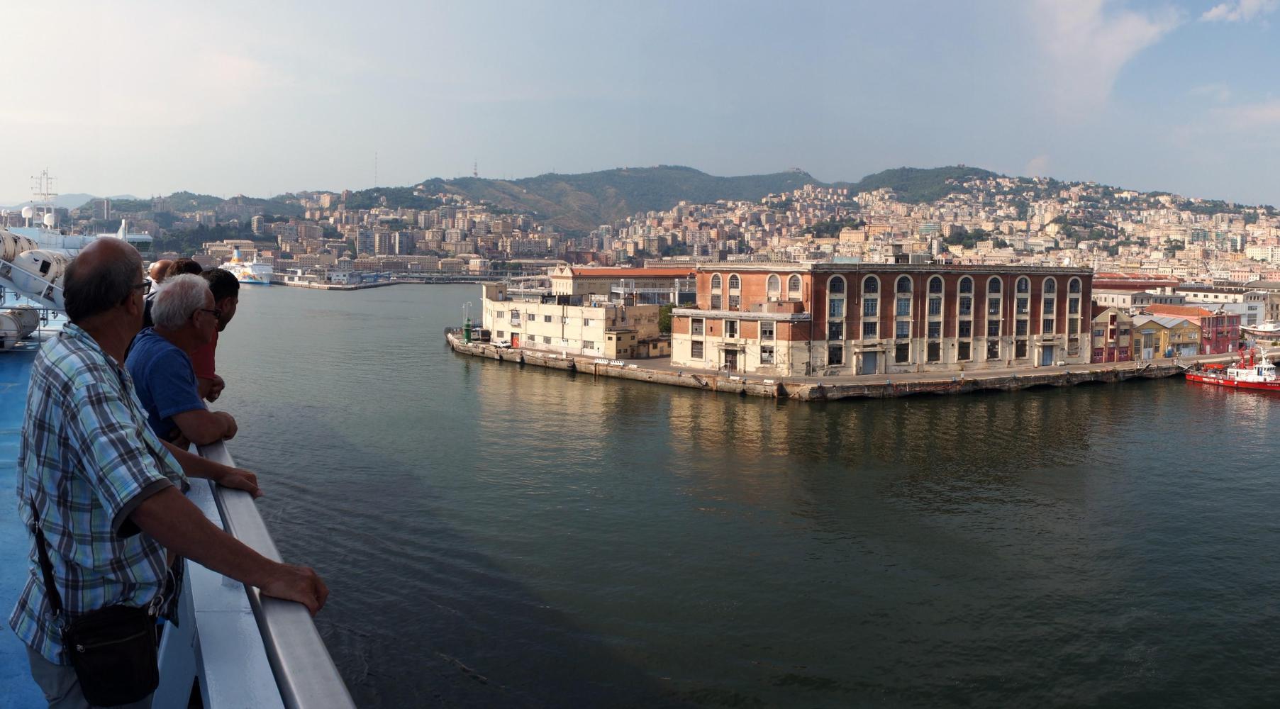 This morning I'm on my way to the ferry terminal to buy a ticket for the evening sailing to Genova. I remain on the cooler shaded side of the street, toddling along in the crowded narrow walkways by construction site hoarding to the waterfront where five big ferries are docked ticking over with an audible murmur; and a sixth ship, a cruise-liner, all ten decks tower above the others.