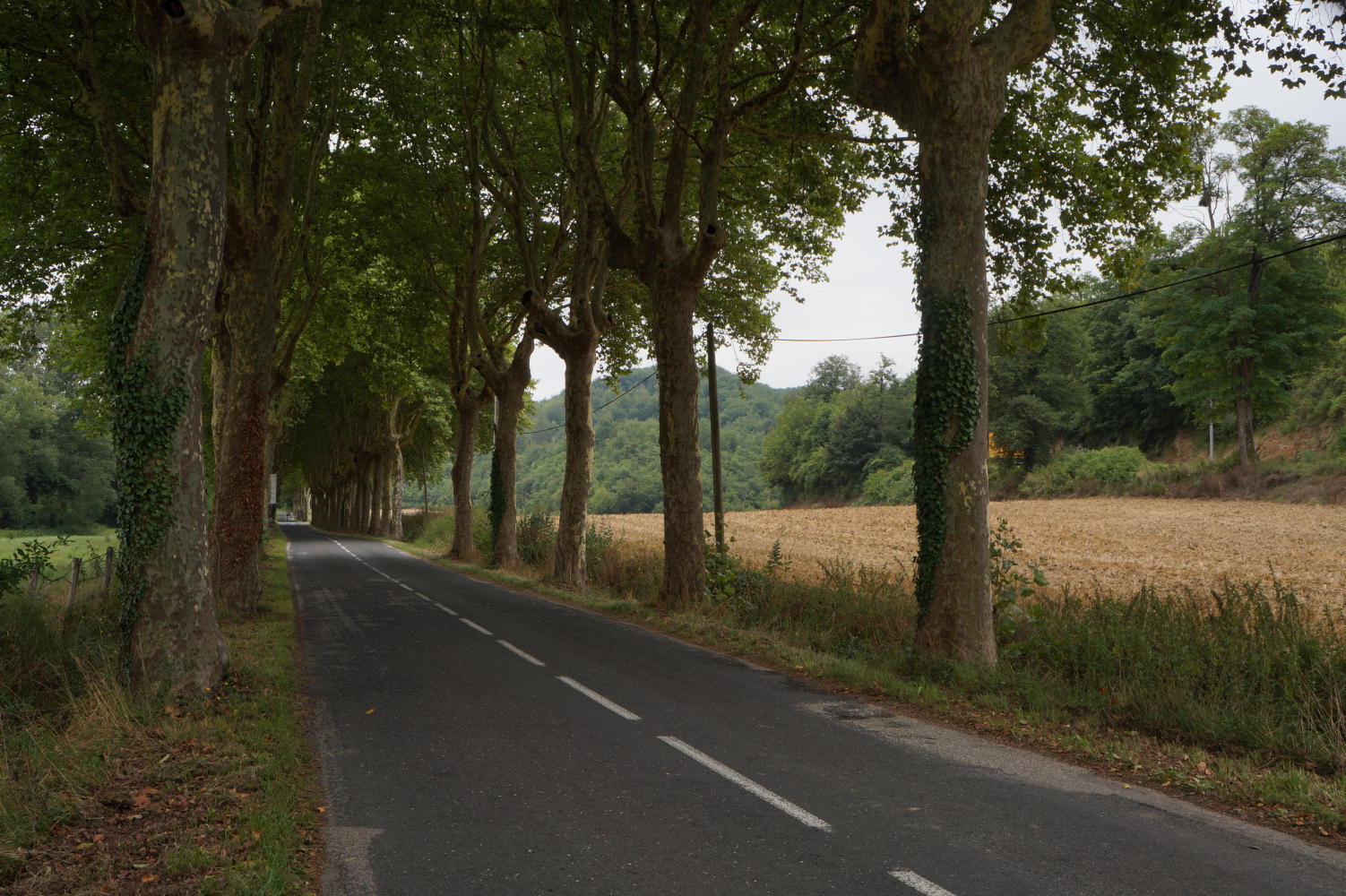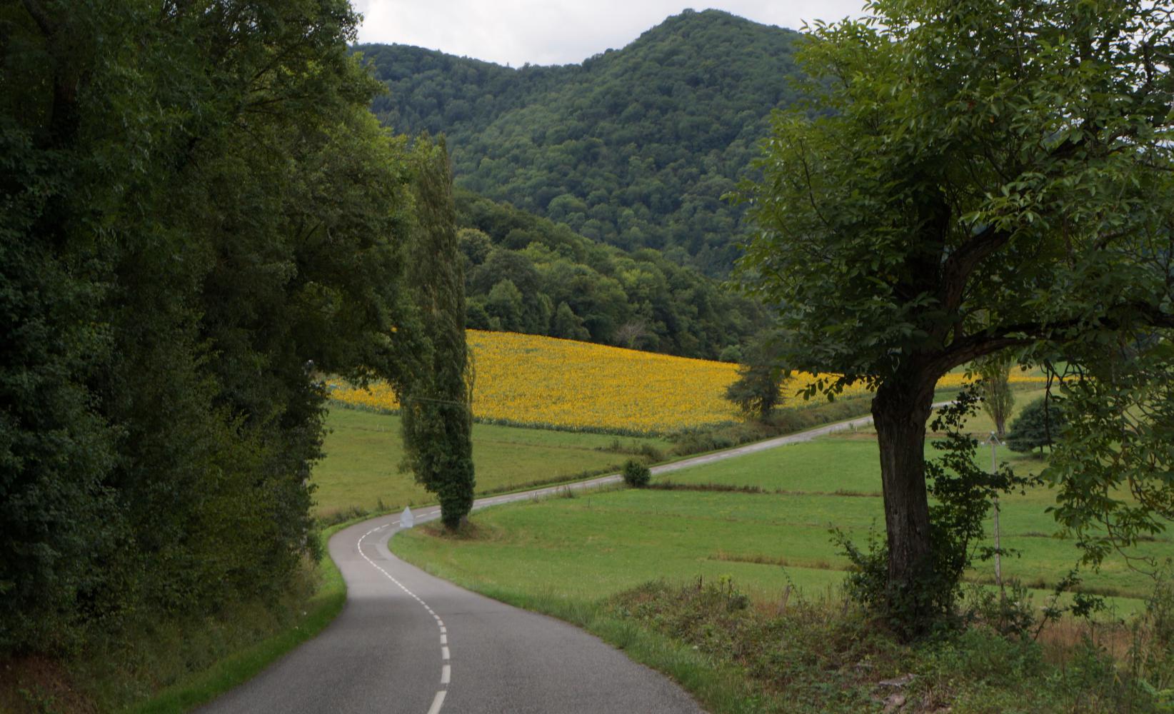 It brightens up somewhat although remaining a day of full cloud cover. I continue on D618 southwest, gradually climbing all the way pass fields of tall maize, sunflowers and wooded hills.