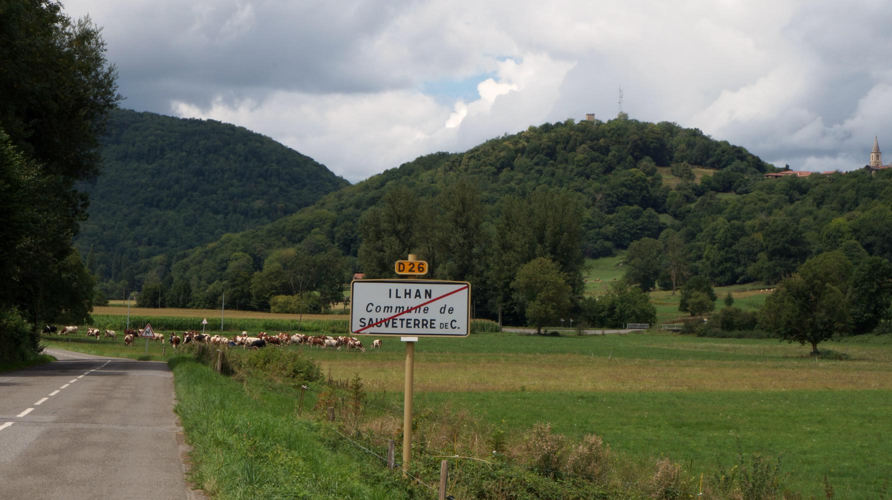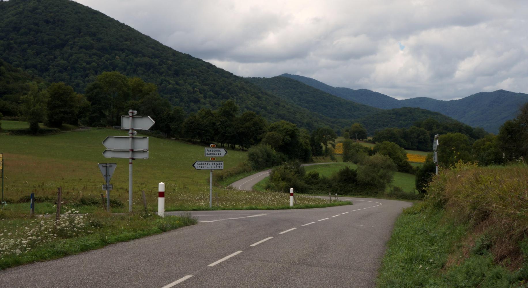 I cross the Garonne river and climb the stiff uphill street of Montreieau town centre, taking me out upon D938 for twelve kilometre west, where at a roundabout, against looking at low cloud on the hills to the south, turn left on D929, a red road on the map and with a sign "Espagne par tunel", a road which will take me to the turning for Col du Aspin. I plan to camp before Arreau from where that road on the map twists off from, so I can buy food in the morning.