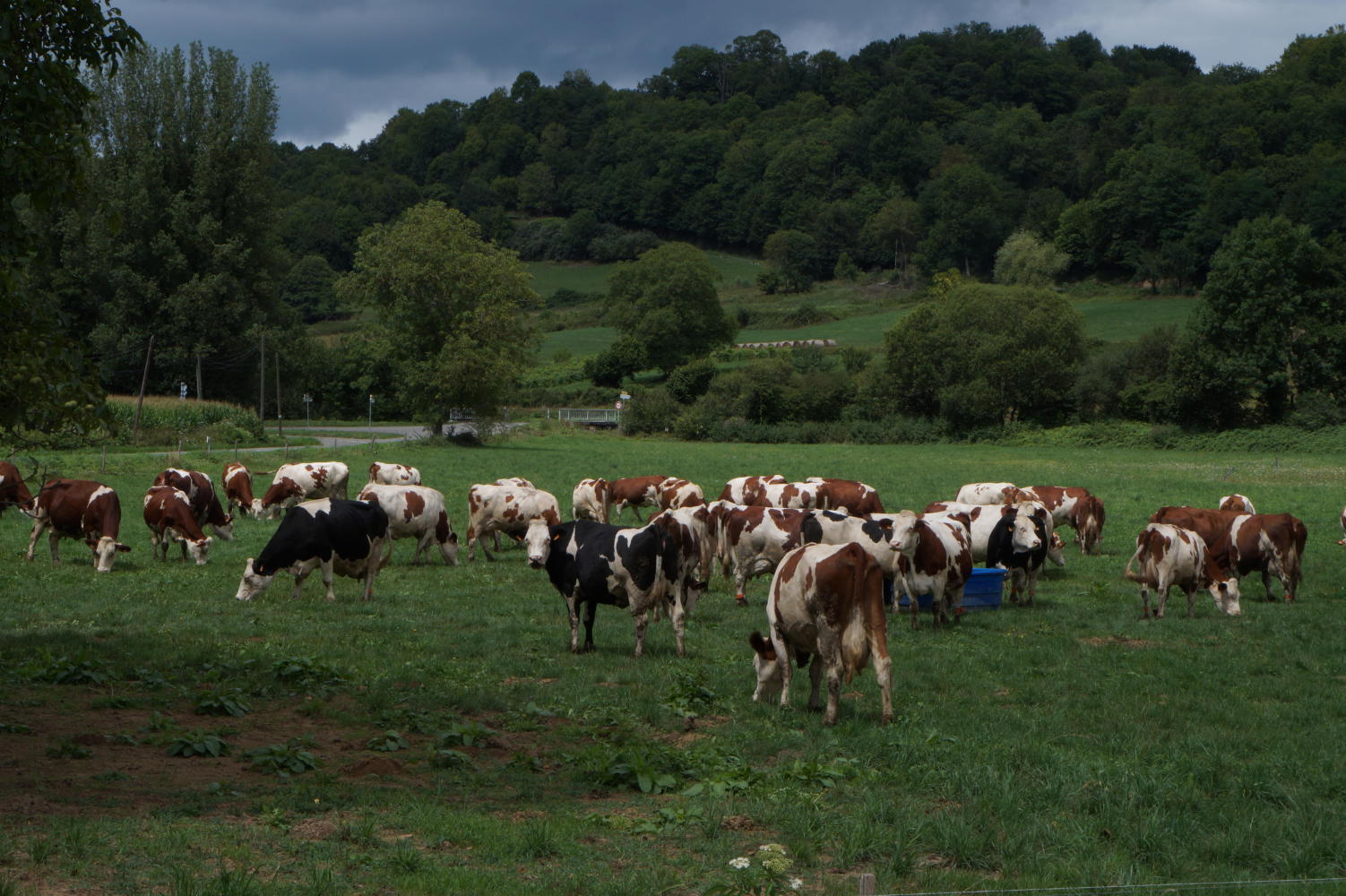 The road on continues gently downhill, but because ahead there's a path of autoroute, busy roads and big towns, I turnoff left at a roundabout upon D26, two parallel lines and white between on my map. Turns out a good move as it meanders through low wooded hills with cow pasture and fields of maize and sunflowers in the valleys.