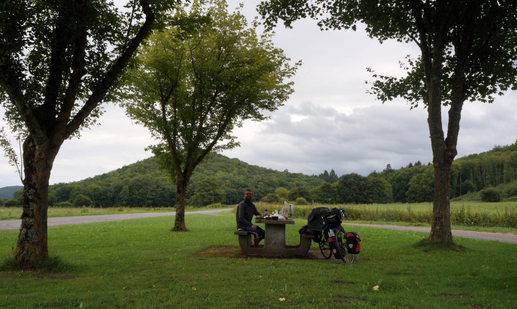 There's the patter of rain on the tent this morning and because of thick cloud cover I'm unaware of how late it is when I get out of the sleeping bag: looking at the watch, it has gone ten to nine. I quickly breakfast, pack and wheel the bike out from my Electricity France campsite shortly before ten.