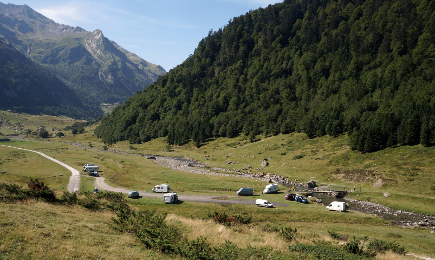 The 22 km board come just after leaving the picnic area having the altitude at 700m and 4%, the gradient in the next kilometre. Good to warm up. Consecutive kilometre markers I reach fairly rapidly. Seems climbing these cols is best when fresh in the morning. I pass up by more picnic areas upon the riverside left, all still have campervans which have been overnighting there, through the narrow wooded ravine with granite peaks ahead. There's a hydroelectric substation and other such installations along the way: that is what the helicopter was this morning: the electricity people... Then I reach a dam wall, at the foot of which, come four steep switch-backs bringing the road up to the level of the reservoir above; from which, the road continues up an alpine valley with boulders the size of large houses scattered willy nilly along a stream through the middle. Finally without much stopping today I climb to treeless rock strewn mountain, rough pasture sloping up to granite crags and pinnacles.