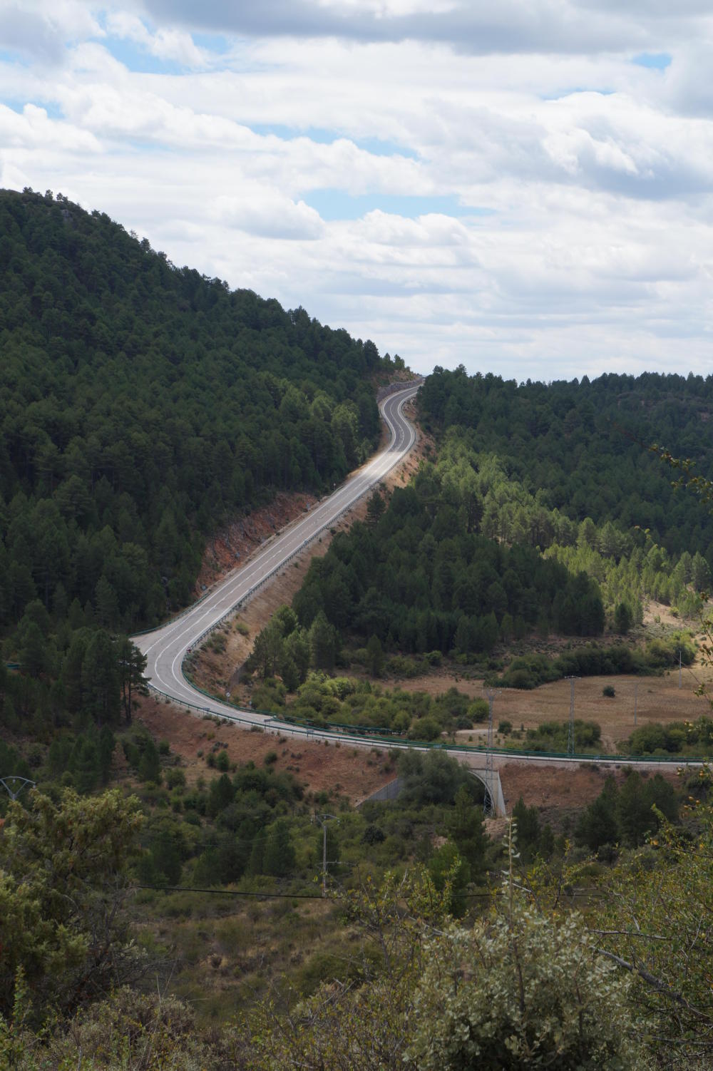 It is almost ten when I ride down the track from my campsite and re-join road CM210 at km 90. The way descends a couple of kilometres through countryside of yellow stubble fields and pine forested hills. Then there's a left split off: a CM2106 with a sign to a place called Terzaga. Pausing a moment to look at the map, it is a longer alternative to remaining on CM210, so I stay on the latter which swings right and goes up a steep incline, the first of many. The way ahead a chaos of hills, forested with rock escarpment high up and deep ravines where the road descends steeply into, followed by something like a steep thirteen per cent climb back out.