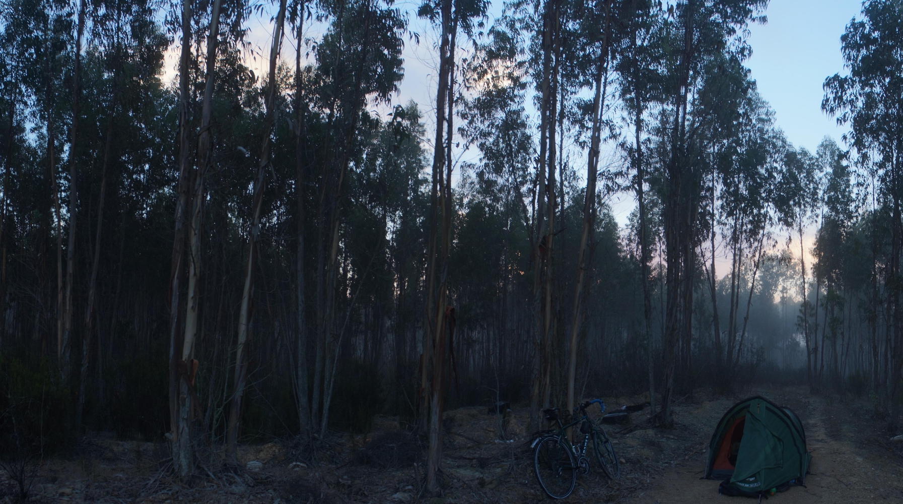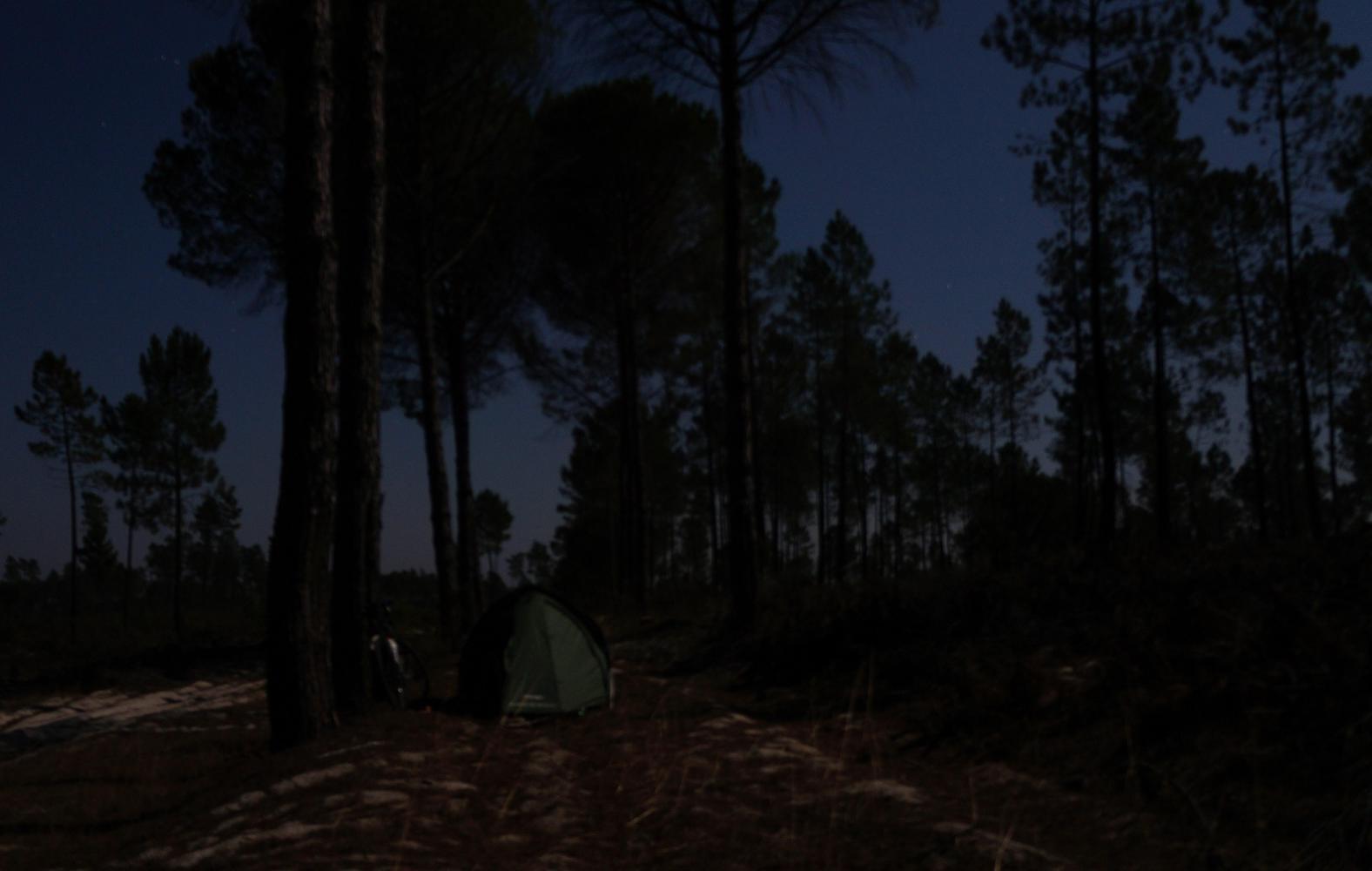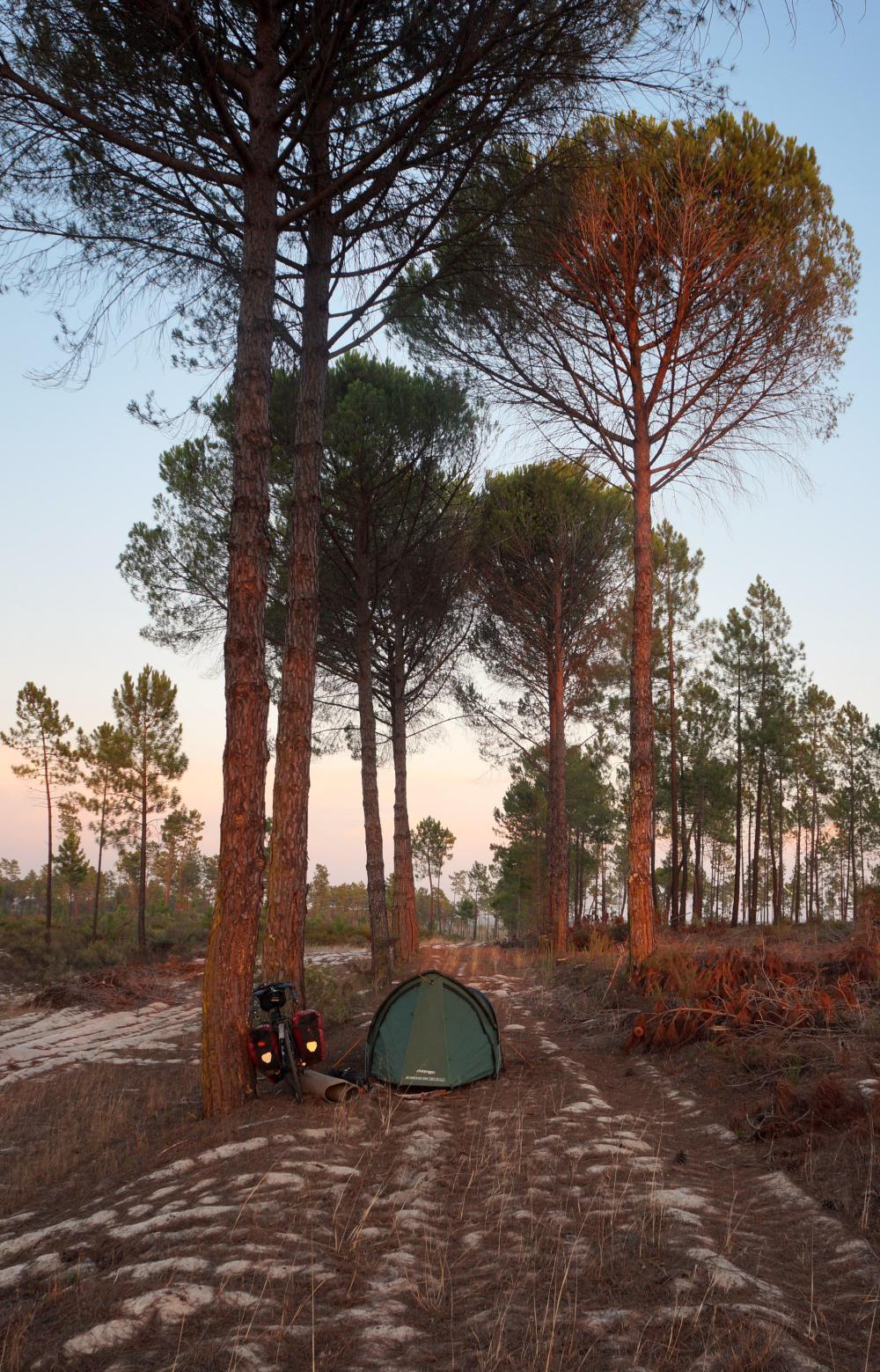 Then N120 continues, coming in contact with a single-carriageway motorway where I turned left and rode off toward the coast in a bid to escape the worst of the heavy rain ahead of me that day. Today the weather such a contrast, I continue to Grandola and turn left upon what is a red road in the Michelin map, so I expect a busy road, perhaps with the possibility of it turning to motorway. Joining it I pass a sign "Lisboa 108 km". The traffic is fairy constant, but there's a shoulder; then, a few kilometres in, the shoulder which has been smooth is reduced to rough broken tarmac and in places, a mix of tar and loose stone screed. Progress becomes painfully slow. Then there's a temporary second lane on my side because of a turnoff, along which a decent shoulder returns. About here, it getting on for seven, the sun waning and seeing a hard packed roadway into loose white sand pine forest on the right, I turn off glad to be off the road. The firm roadway come to an end, continuing as car tracks through the loose sand, which I trudge through pushing the bike a little way until finding a place, level and the sand bound by fallen pine-needles, where I set up the tent for the night.
