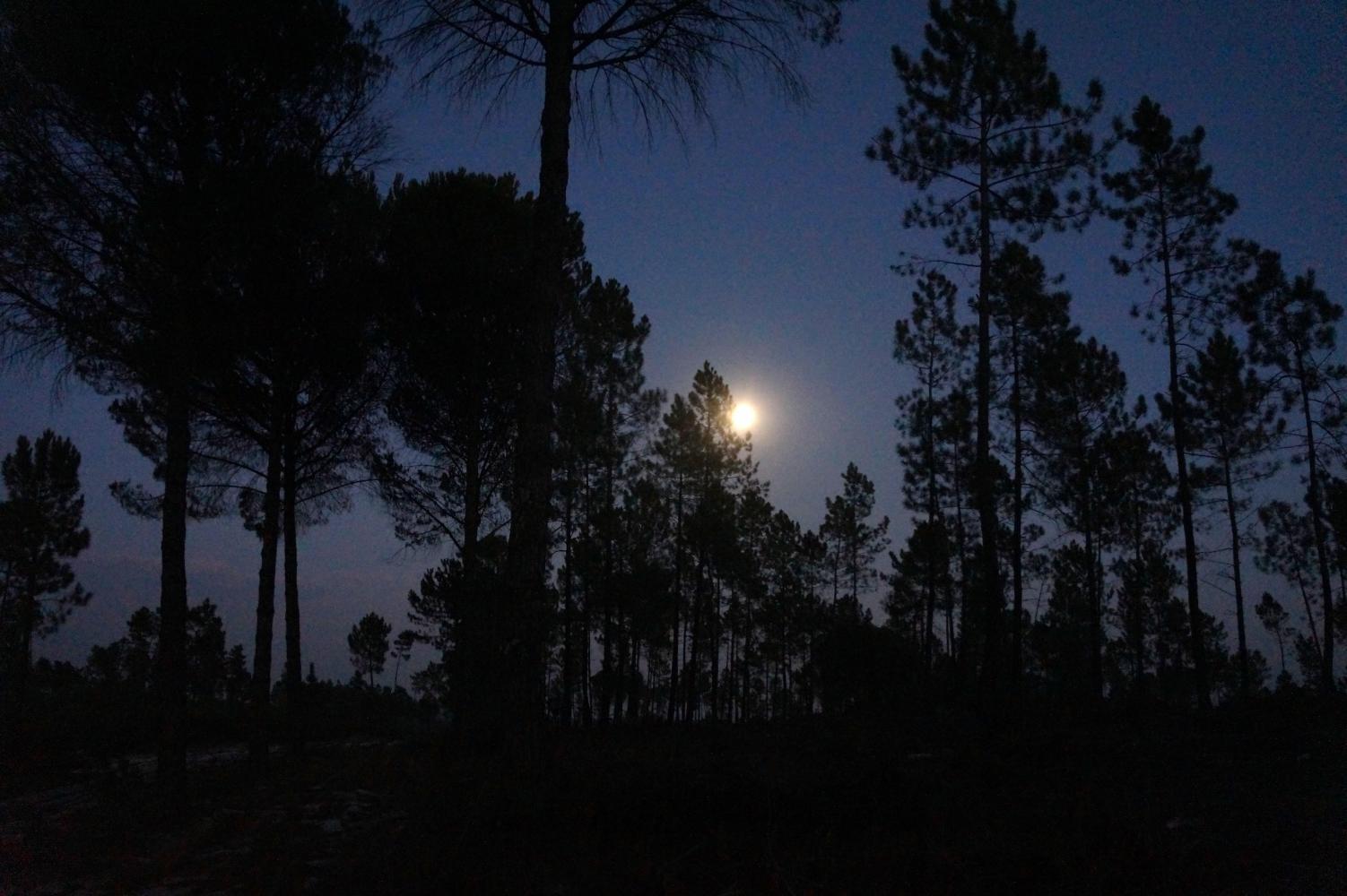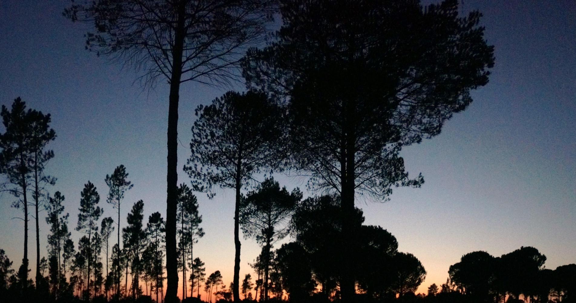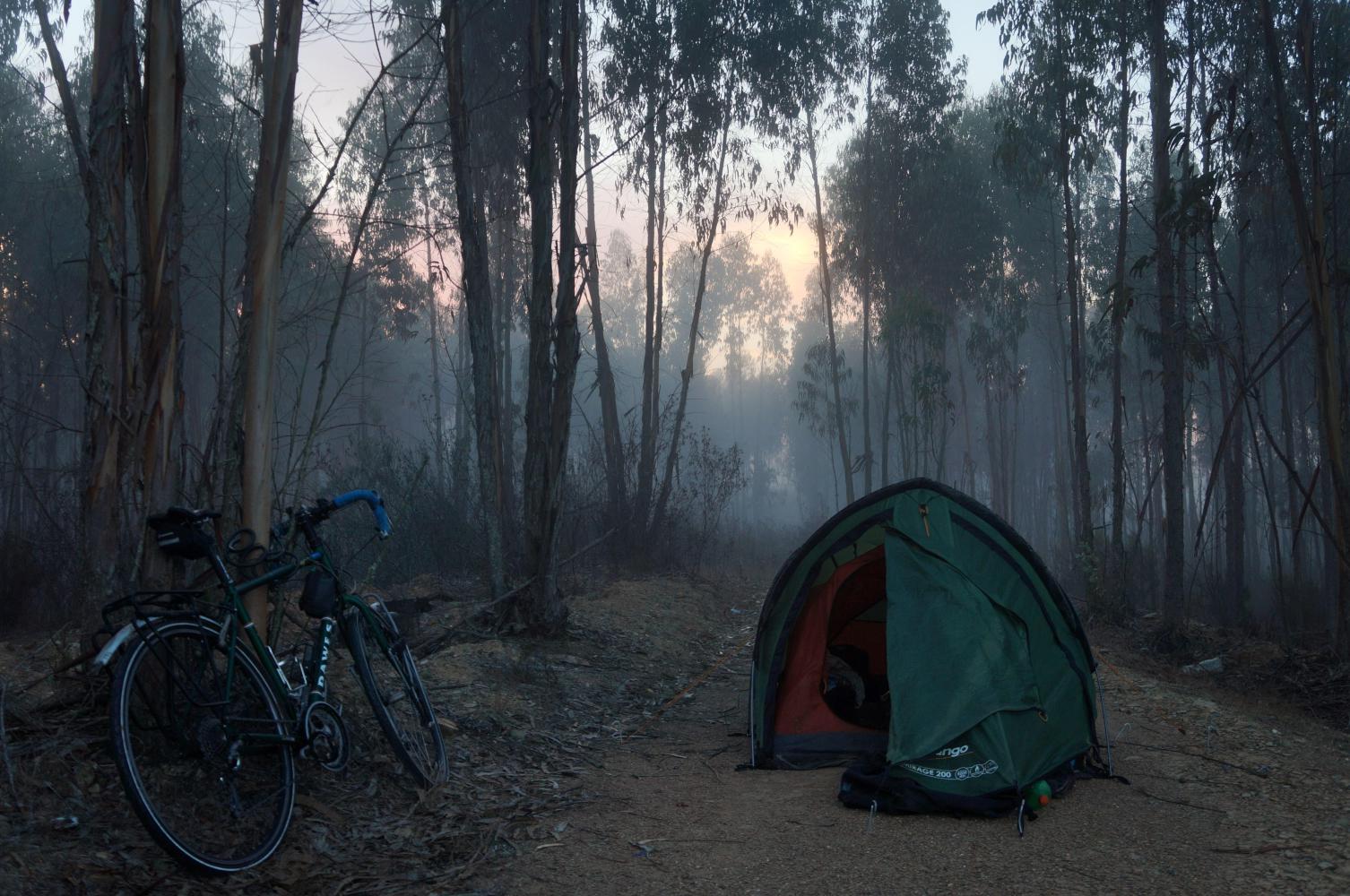 Then N120 continues, coming in contact with a single-carriageway motorway where I turned left and rode off toward the coast in a bid to escape the worst of the heavy rain ahead of me that day. Today the weather such a contrast, I continue to Grandola and turn left upon what is a red road in the Michelin map, so I expect a busy road, perhaps with the possibility of it turning to motorway. Joining it I pass a sign "Lisboa 108 km". The traffic is fairy constant, but there's a shoulder; then, a few kilometres in, the shoulder which has been smooth is reduced to rough broken tarmac and in places, a mix of tar and loose stone screed. Progress becomes painfully slow. Then there's a temporary second lane on my side because of a turnoff, along which a decent shoulder returns. About here, it getting on for seven, the sun waning and seeing a hard packed roadway into loose white sand pine forest on the right, I turn off glad to be off the road. The firm roadway come to an end, continuing as car tracks through the loose sand, which I trudge through pushing the bike a little way until finding a place, level and the sand bound by fallen pine-needles, where I set up the tent for the night.