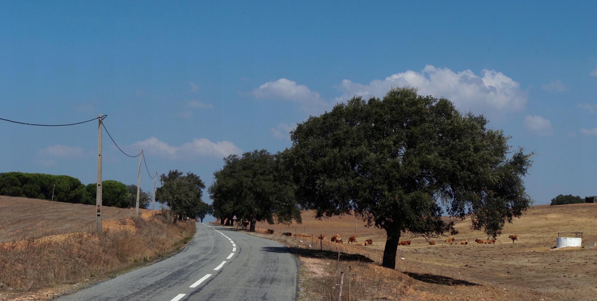 It is twenty-eight kilometre more to Santiago do Cacem, flanked by parched rolling brown pasture dotted with trees. The traffic but a trickle. And further there's a long steady climb through more precarious hilly country. Where an old stooped grey-haired woman having led two black goats across the road, is now gone back over to coax the rest of the herd over. But the goats are stubbornly not listing to her call, preferring to remain nibbling the bushes on the side of the road they're on.