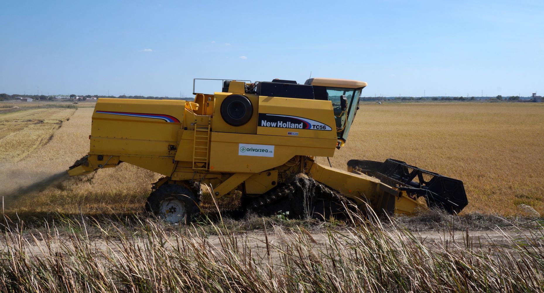 There are large fields of a short ripe yellow crop, which combine harvesters cut their way through. I've seen this crop before in South America. Its rice. The ground is soggy, evident as the machine runs on caterpillar tracks, muddy water running off the track plate as they rotate up off the soaking underlay.