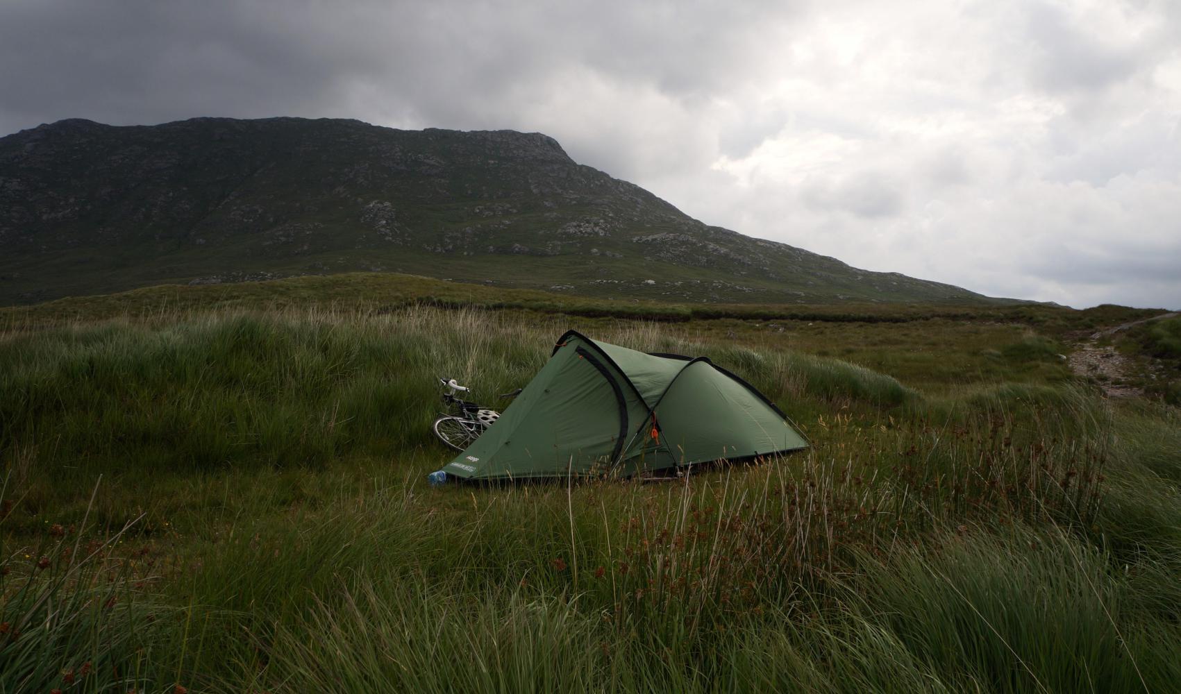 I thought it was raining on first waking up, but it was windborne sand raining on the fly-sheet. The wind isn't strong, just a stiff breeze rocking the tent and causing the long tufts of mountain grasses to wave back and fore rapidly. It has gotten rid of the midgets and coming from a south westerly direct, has brought with it thick grey cloud cover, floating low around the surrounding mountains.