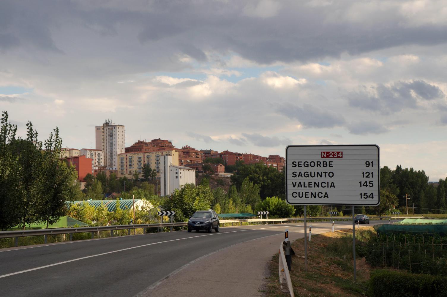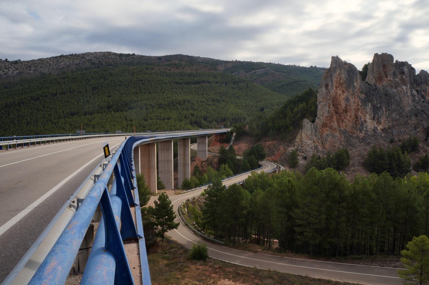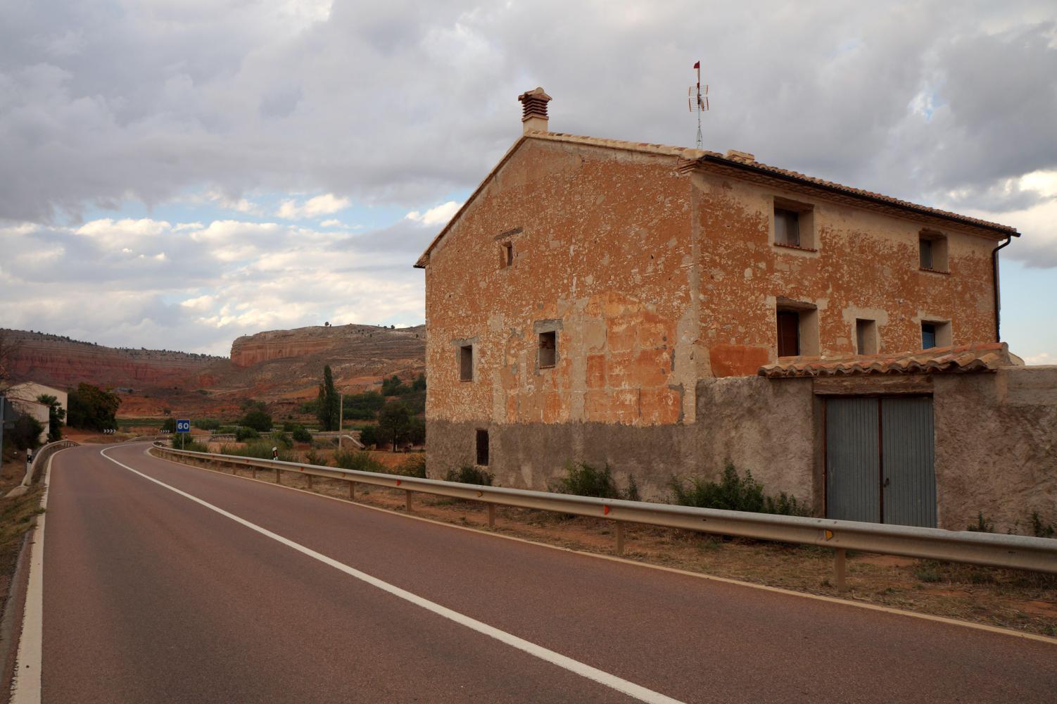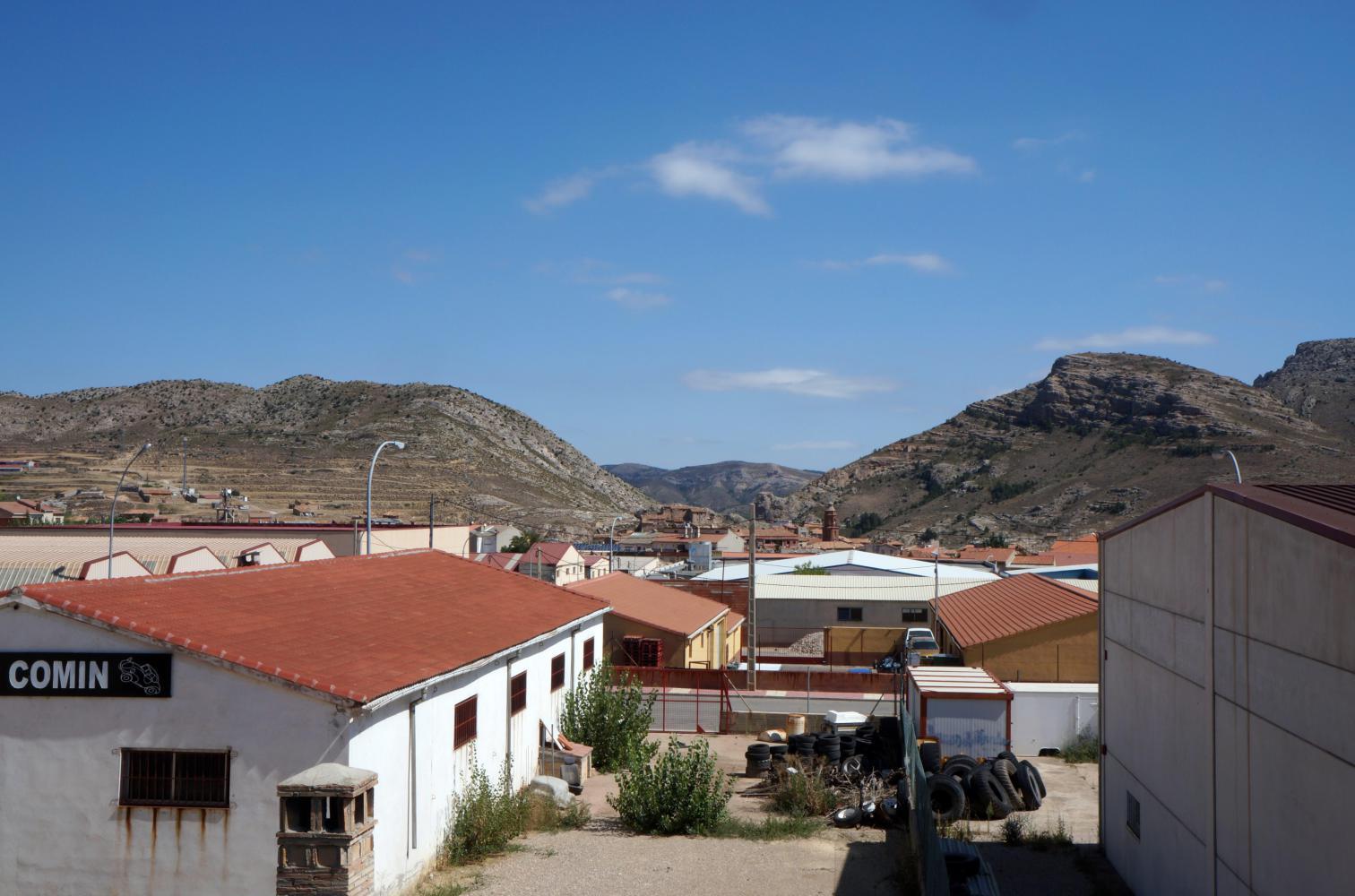 Three kilometres in I enter the old mining town Utrillas. Old as it says something to that effect on a board on the way in and "Patramonial Humanidad", a bit like UNESCO. The Mercado in the plaza has the shutters down. No surprises, the day being a holiday remember. Cafes are open of course and I attract a lot of stares as I lock my bike outside one. Next door is a panadaria. The only place I'll fine food today.