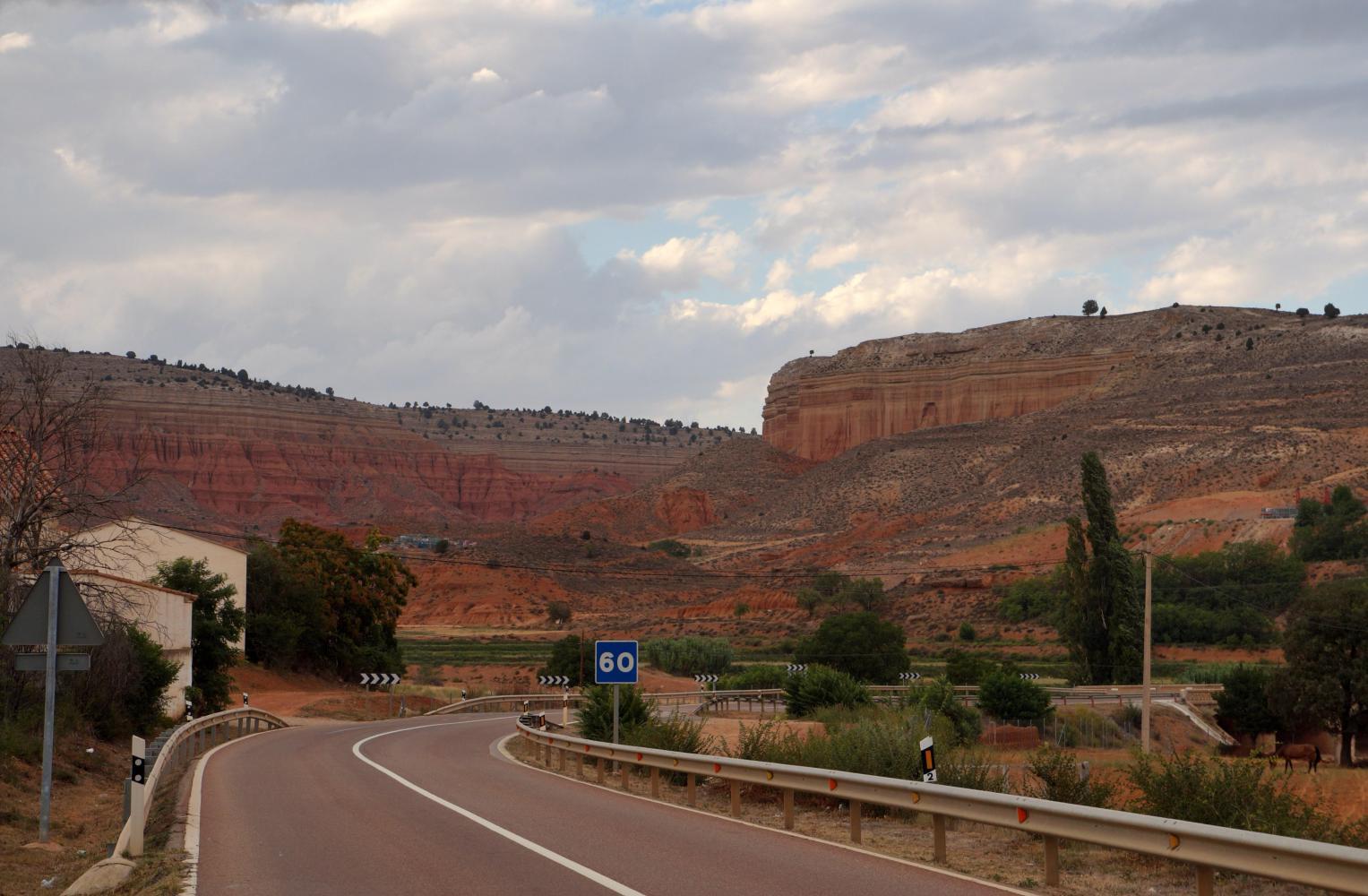 Next the road spirals down to Monteban and after passing through a long narrow street with cafes, the road continues straight along a flat valley of small farms with vegetable plots, sheep and fruit groves for a couple of kilometres to a roundabout where I turn left, back towards the towering hills to the side, joining route N420 and pass a sign: Teraul 74 km, corresponding to the map and reassuring me I should easily make it today.