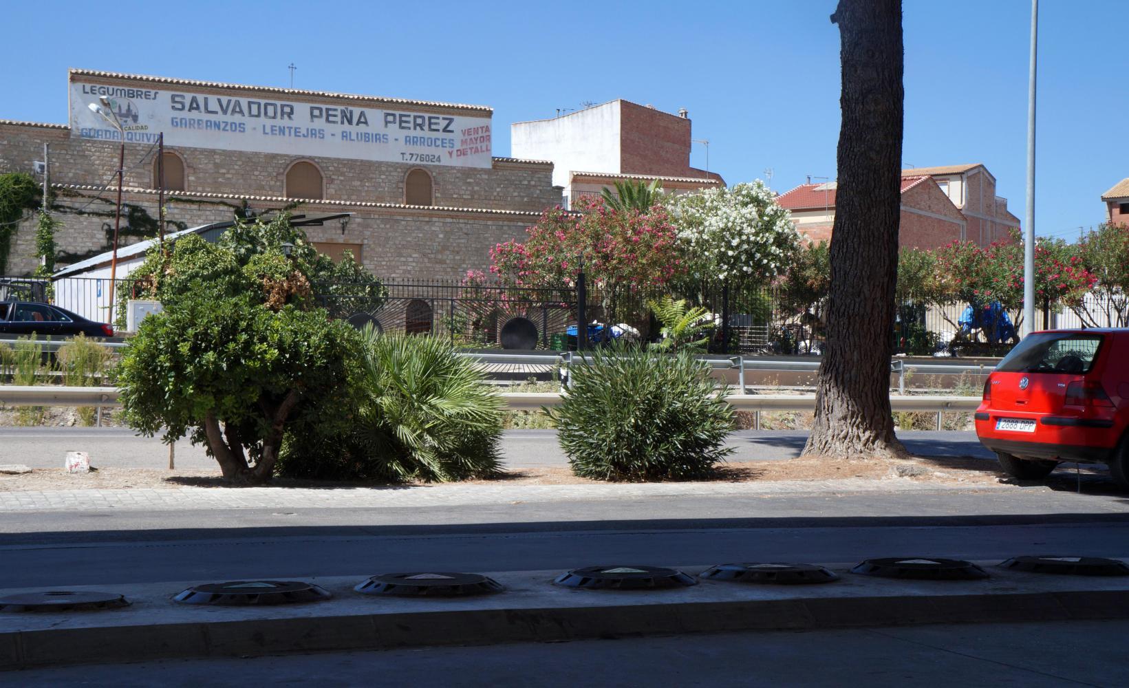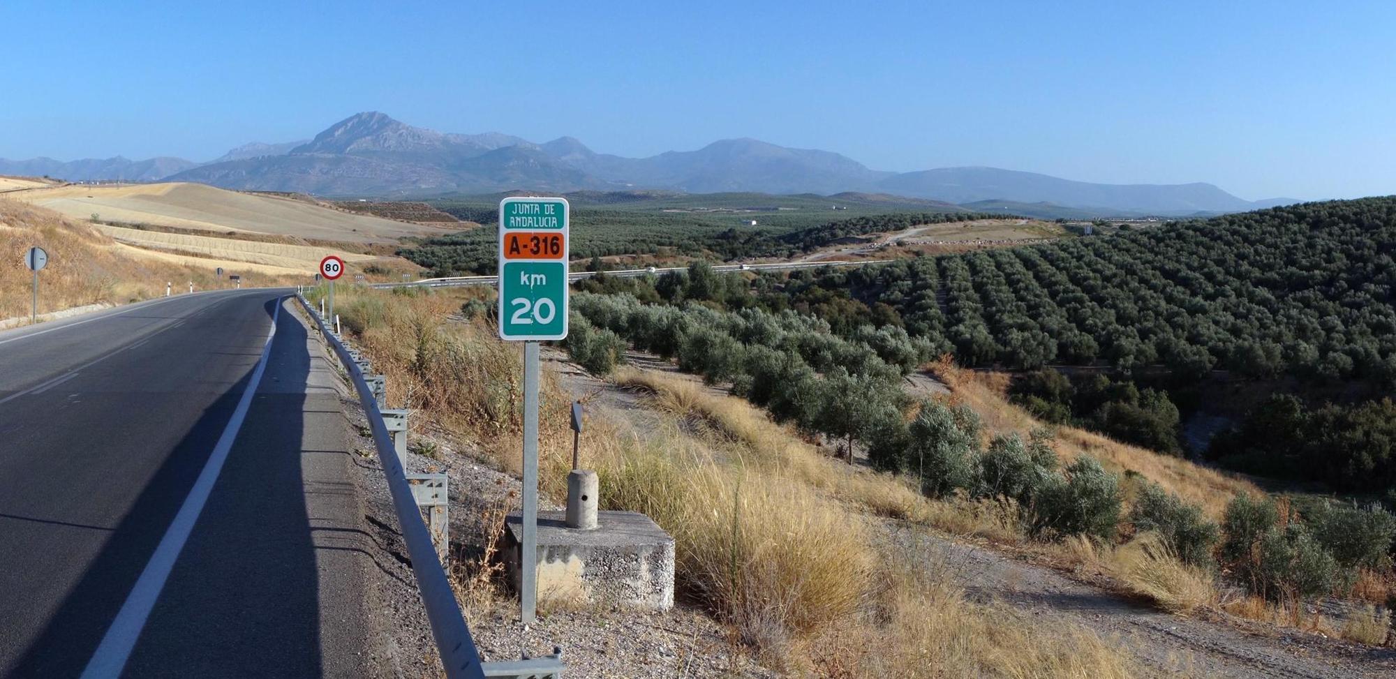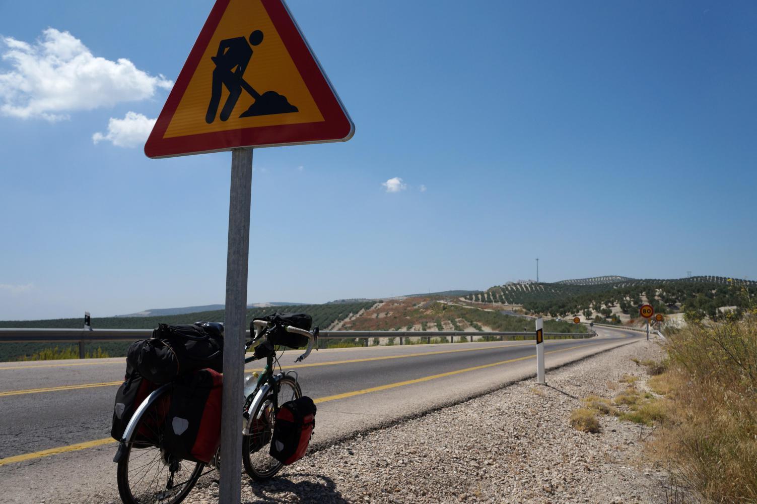 Its four when I move again. There's a big split in the highway after Abeda with many roundabouts. I want the way to Jaen and that road is a autopista, but with a nice cycle-lane on the inside of a concrete barrier and a couple of kilometres more I lunch late under an olive tree at five. Afterwards the cycle-lane ends at Baeza. Here the road reverts back to single-carriageway, but with an extra carriageway to the side partly built but looking like no work has been done for quite a while, perhaps due to lack of funds. Then coming to a section that has been finished, there's a service road along the new autopista onwards.