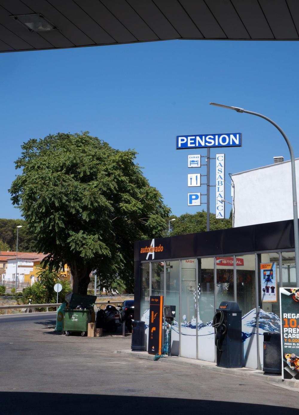 Eventually the road levels out. I believe it couldn't go on getting much higher as I enter Abeda, approached by industrial warehouses along the highway, then through the centre, a steep straight descend between weathered old buildings levelling out at the bottom where I'm glad to pull into a Repsol gas station. There I rest savouring a cold beer and snacking on crisps.