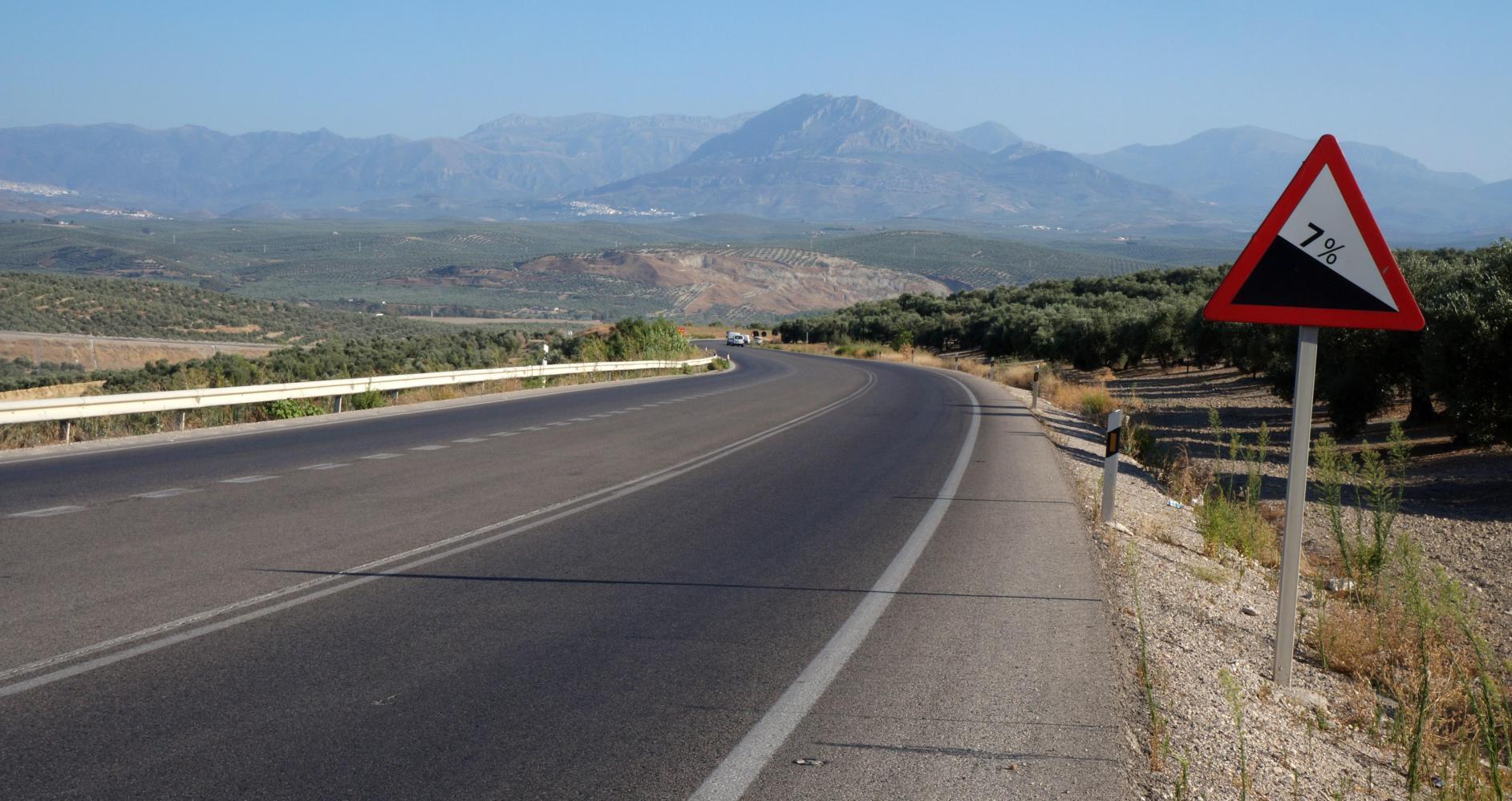 Once rested and feeling okay I get going. Rejoining the highway the way is steadily up. Then after a section of roadworks with a temporary detour road with steep gradient, a serious long climb follows higher and higher with a vista to the left off to the south toward a barrier of mountains. Reminding me there's a lot of climbing ahead in the days to come.