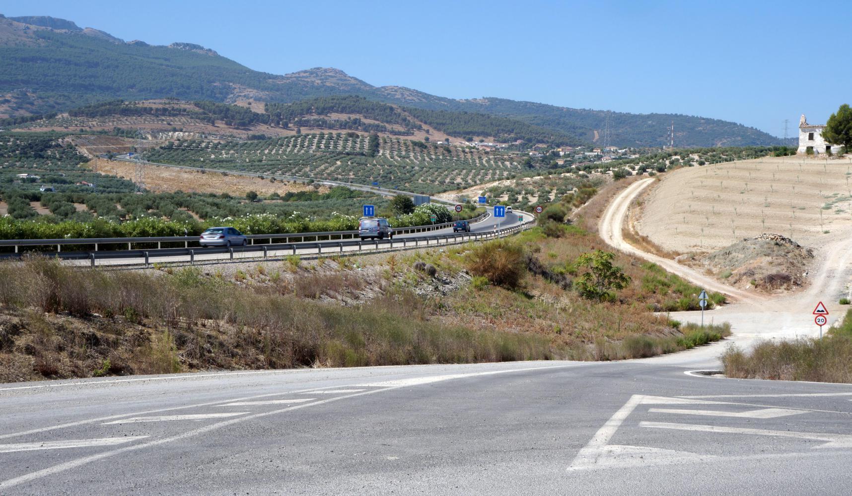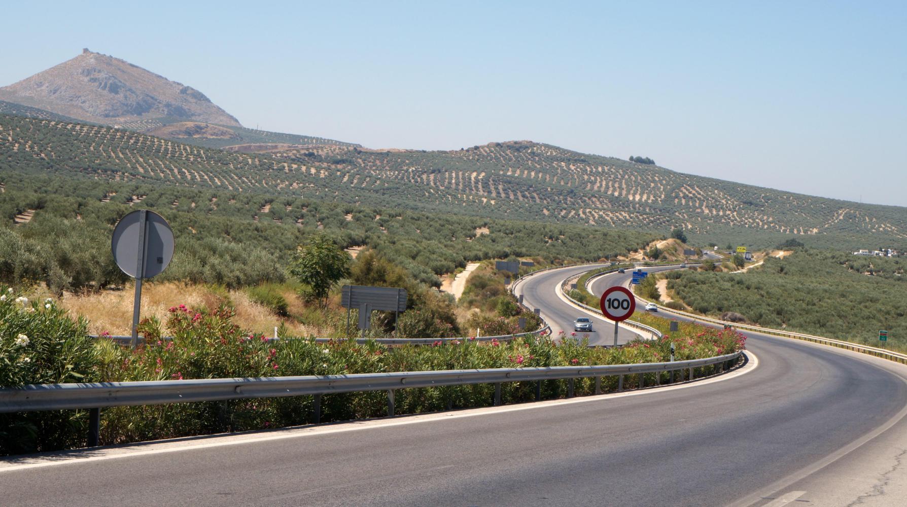The smooth surfaced roads with adequate shoulders I've ridden on so far have ceased. The road now A316 has signs of being rebuilt, I've mentioned in the previous page, extended to dual-carriageway autopista. The scheme being abandoned presumably because of the recession. The single carriageway with vacant unfinished band running alongside (though cannot be ridden upon because of regular cross trenches) has next to no shoulder and a deformed and broken edge. But the final stretch to Jaen was finished and from my olive grove campsite I'm on the traffic free service road into town which happens to be a sizable city with a university and nice water-sprinkler greens in a central plaza. A reprieve before taking the road out to dry parched country again, where the only way onwards is the autopista.