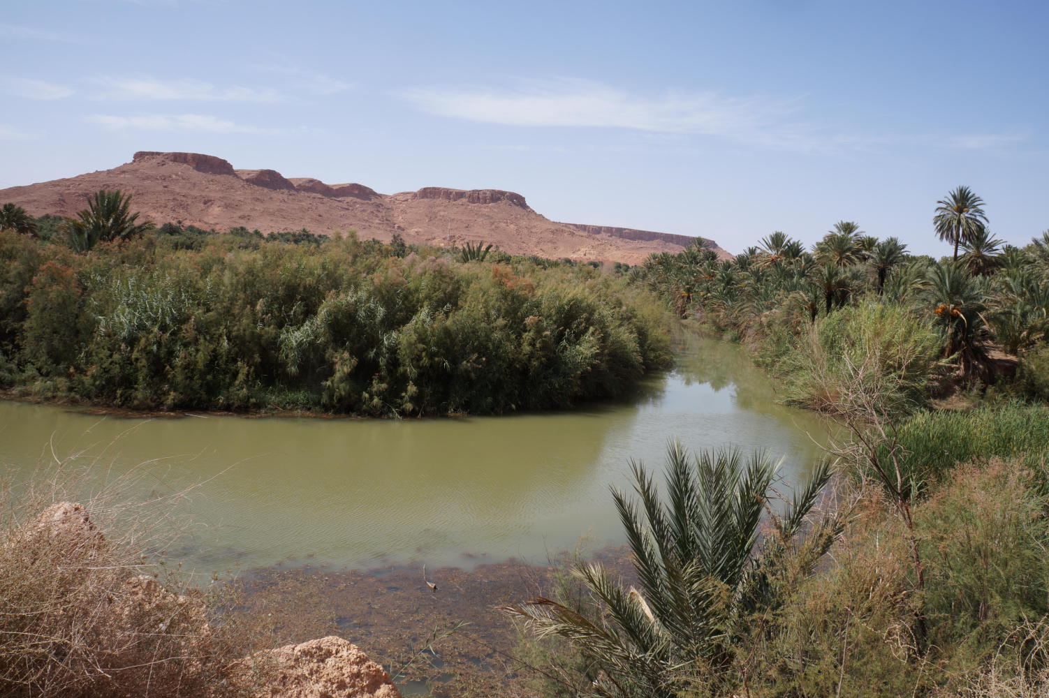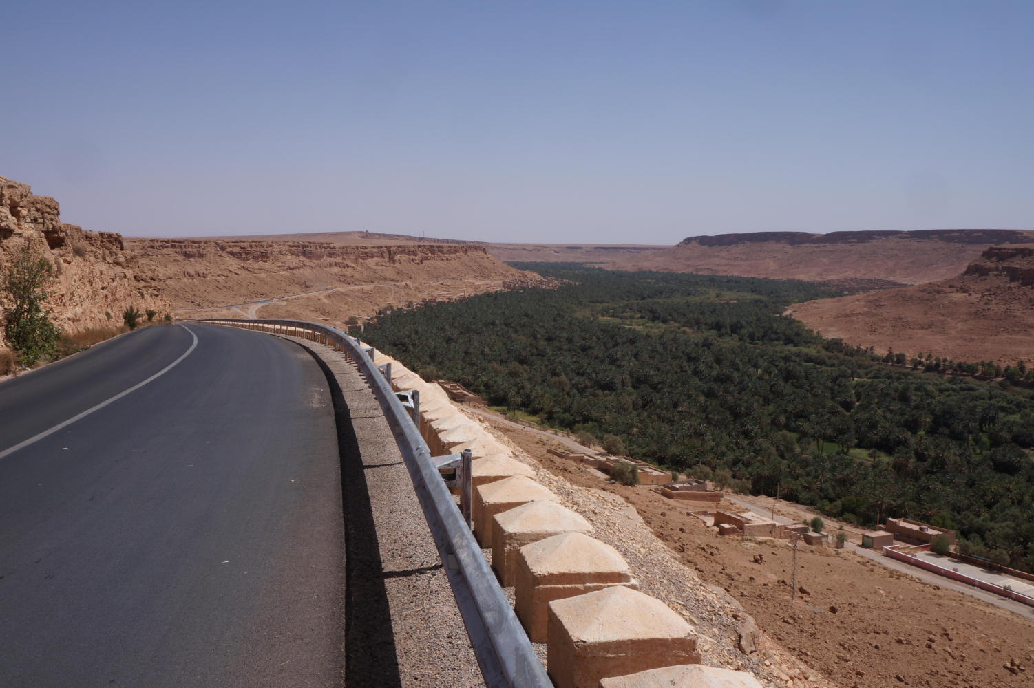 It is thirsty table flat desert ahead I suppose. But at one o'clock I reach a Berber craft shop and restaurant and from the balcony eating area in front, I'm suddenly stroke by the view. I see what I hadn't seen from the road nor parking area where I pulled in. An opening across the desert, the road on descending down into a canyon bottoming out in a forest of palm trees which would continue along the canyon and be my companion for the rest of the day to Erfoud.