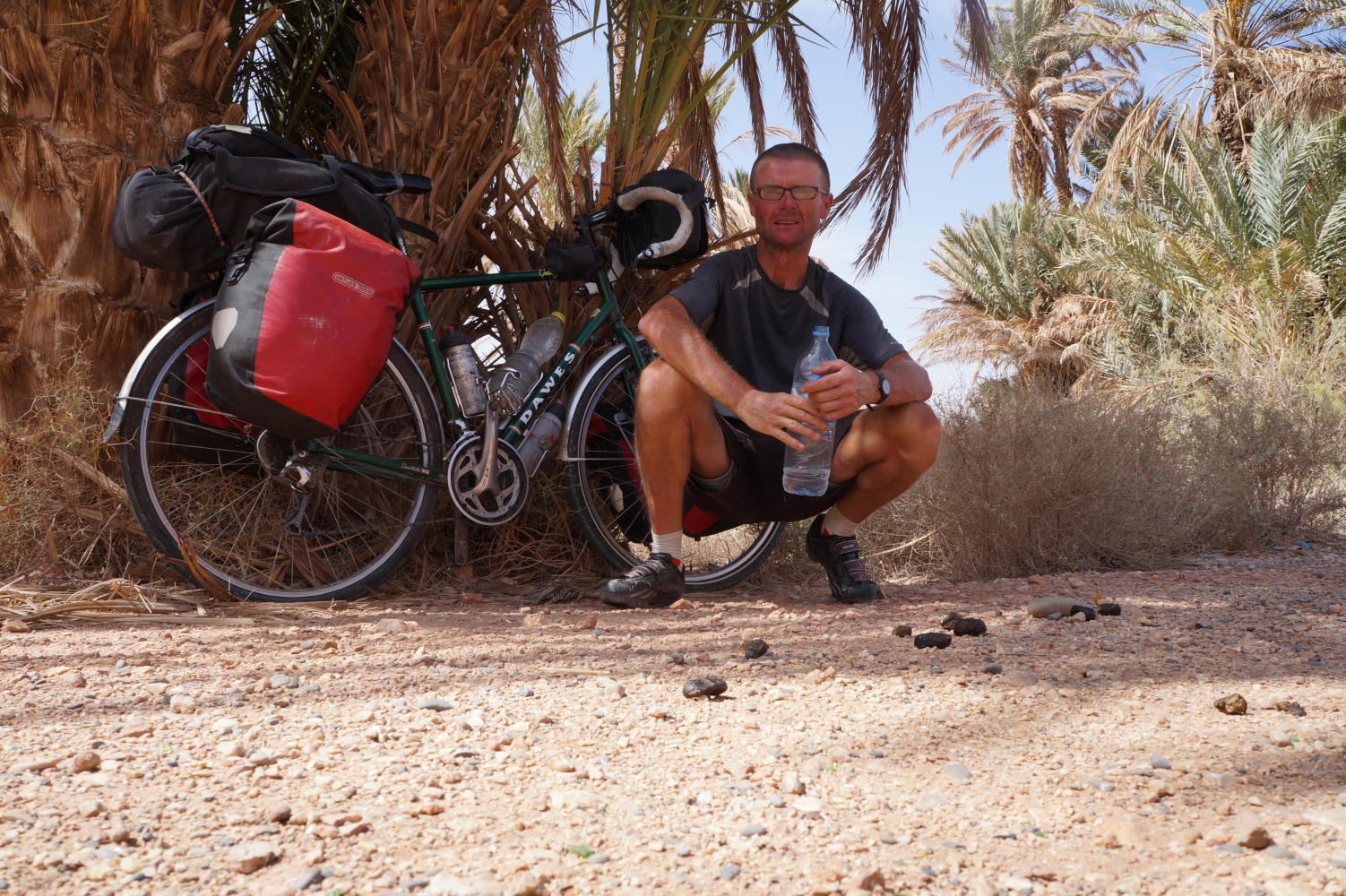 I met Karla and friends the afternoon before. Another car that pulled over offering me an excursion into the Sahara sand dunes. Also said he runs a tourist complex with camping and all facilities on the way into Erfoud, so the campsite is where I headed for today. A large plot enclosed by high walls and well shaded with clumps of palm trees.