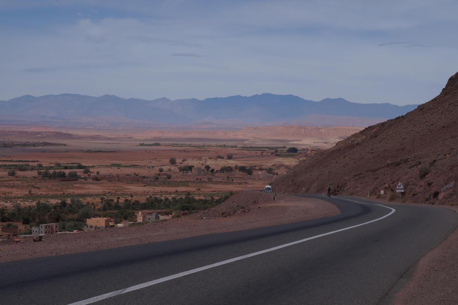 The mountains loom blue to the north above the light brown undulations of the desert. I stop to take a photo at the top of a descend and spot coming on ahead of a labouring truck on the way up, a cyclist, unlike the many cyclists I've seen in Morocco, going much faster and uphill too. When the cyclist reaches the crest where I stand he is lycra clad and riding a twenty-first century racing bike. A new for Morocco. An enthuiasic cyclist.