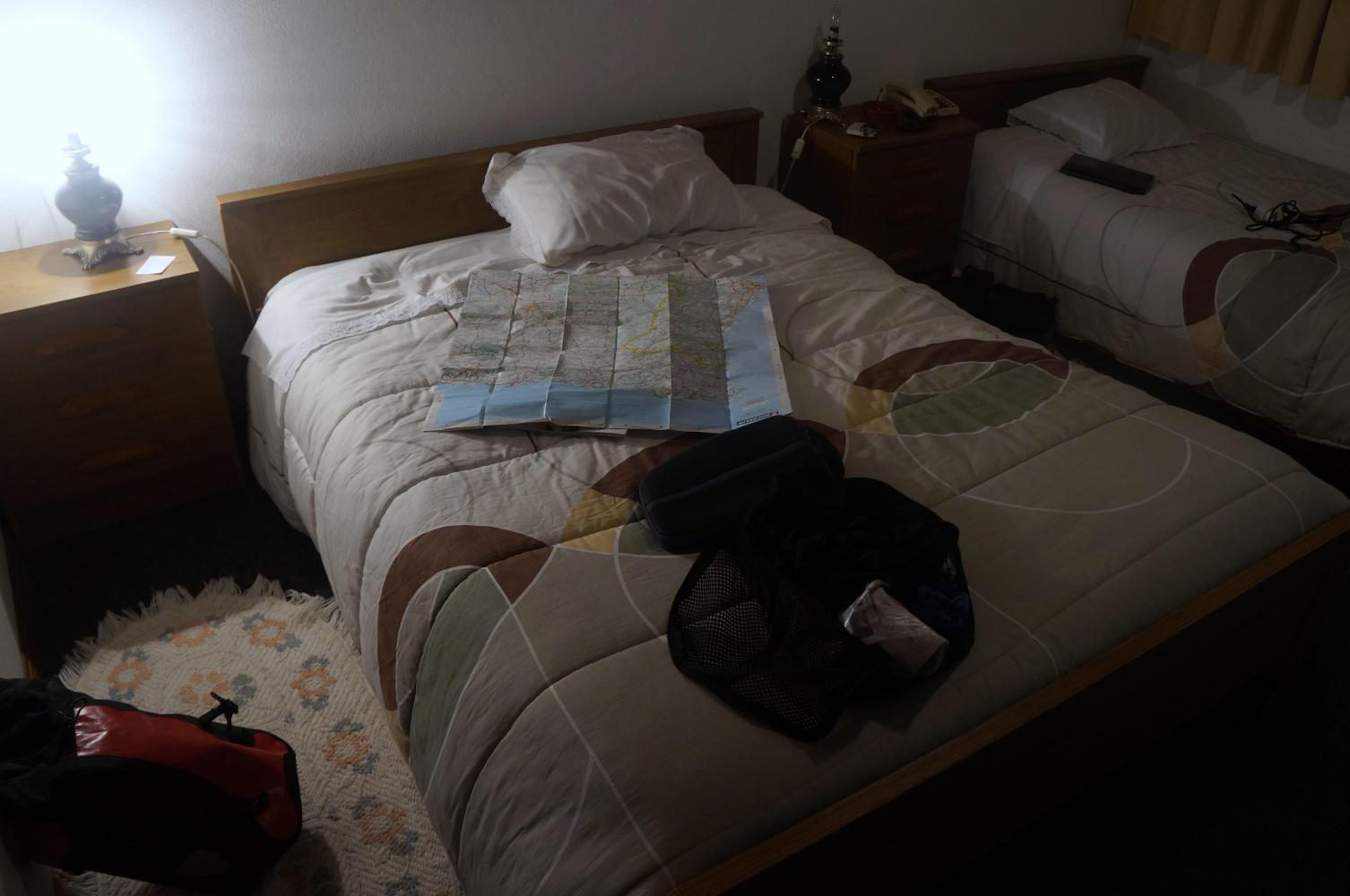 I wear my yellow hi-vi vest and have the rear light flashing as dull murk intensifies and oncoming vehicles approach out of beaming headlights. The shoulder is a narrow strip which is rough and broken in places with a slope into a storm drain alongside making the downhill parts of the straight undulating road feel especially hairy and I'm passed by lots of trucks. One sends a shower of water up round me. I'm wary of close passing trucks on my left and crashing into the drain on the right. I consider camping anyway as it is just too dangerous continuing when I pass a board for a restaurant three-hundred metres, which will be at the top of the next hill. I hope there's accommodation there too. Reaching the top of the rise I ride off on to the paved forecourt. The four-story block over the restaurant has Residencia in eliminated letters at roof level. I'm in luck. When I inquire inside, the woman says "o mais ecomomico.." then browses the computer and says twenty euros, but no breakfast. Well can't have everything. She then comments on the weather in Spanish and says tomorrow is for rain too.