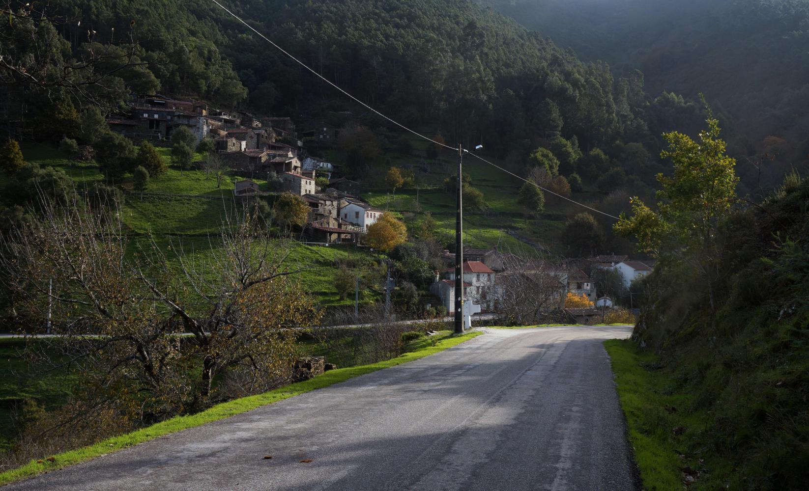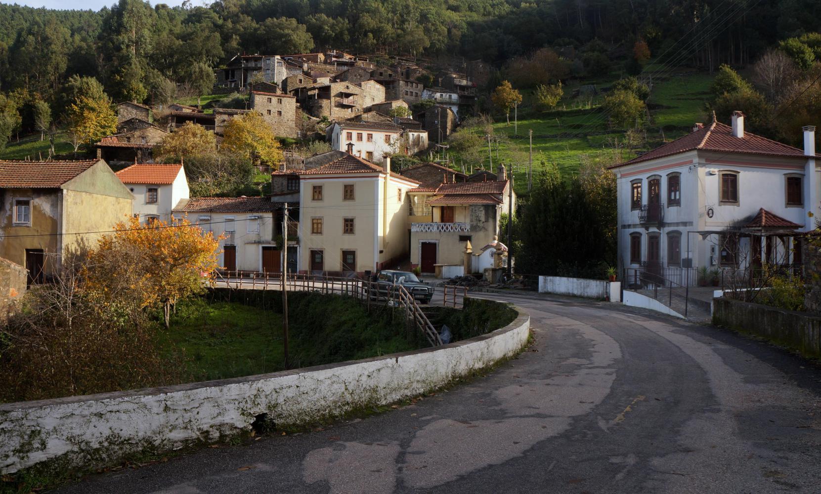 The road onward climbs again through the wooded sides of the valley before descending to Gois and am on a national road to Coimbra briefly to a roundabout where I take a little road toward Aganil. Such a fabulous day. Crisp Autumn sunshine, yellow and gold deciduous trees blend with evergreens. The roadside and verge covered with fallen leaves. Pass small farmsteads with small pale green plots of fields along the valley before the road begins a steady climb. Cows with clanging bells move along in the trees to the side.