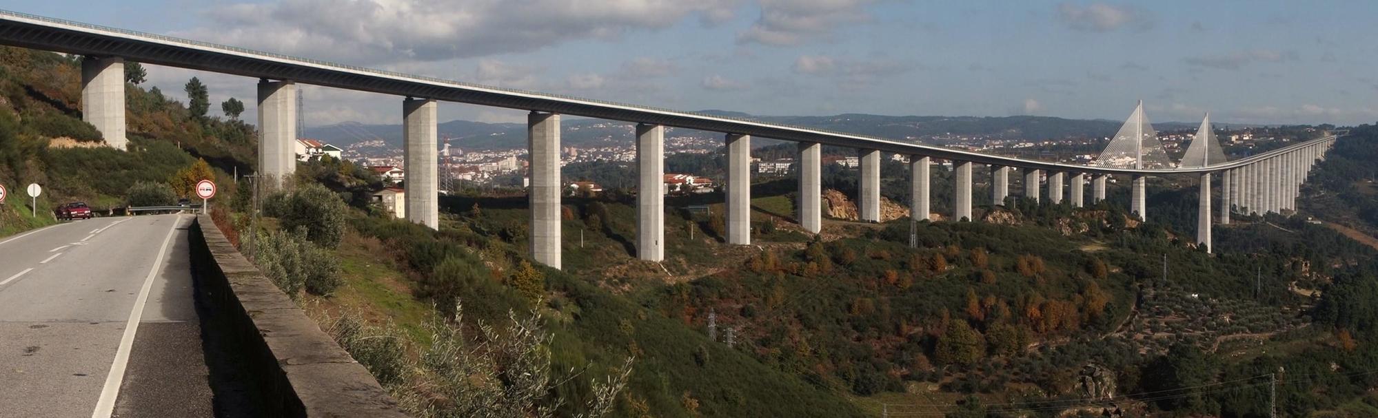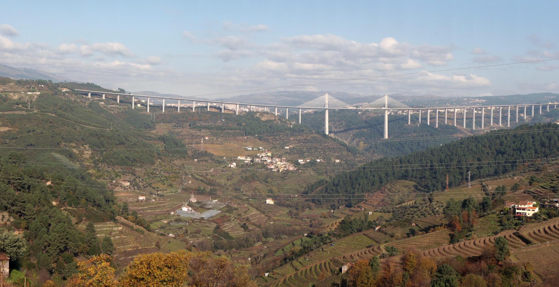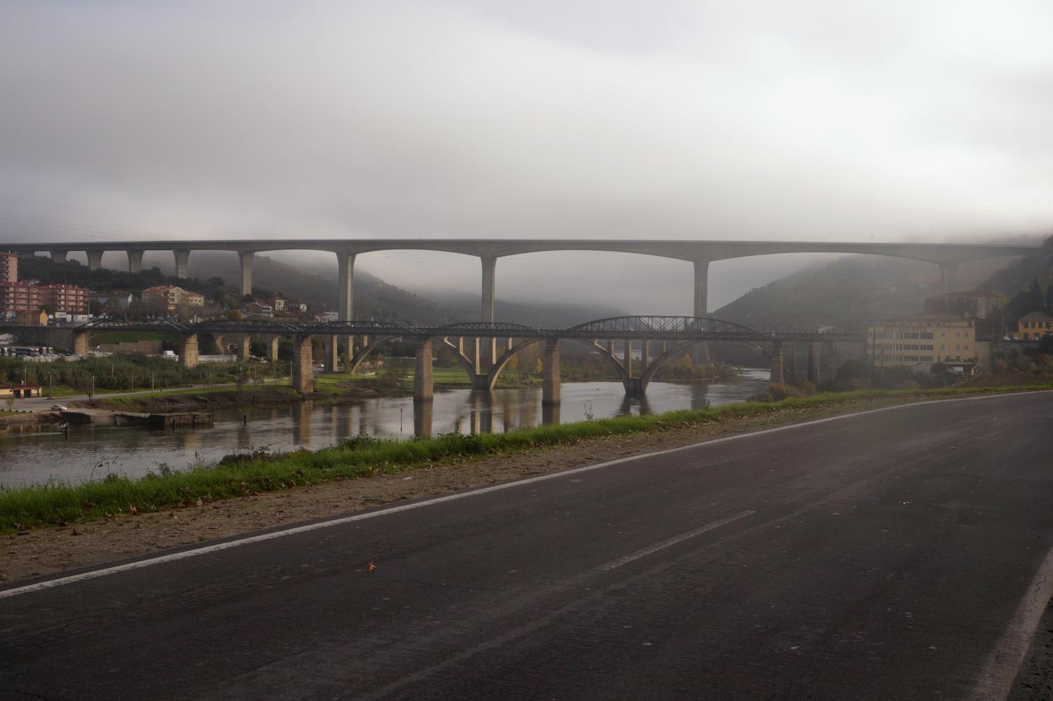 With appetite satisfied I make one more stop at a small independent supermarket on the way out of town for a few things for later. The road goes up then, but only for a short bit. Cresting the hill, there is a longish descent with the inevitable knowledge that I'm going down into a deep hole which will have to be climbed out of. And sure enough when there is nowhere further down the road can go, the way rounds a corner and crosses a bridge and climbs. This turns out to be the longest hill of the day. Though not terribly steep, it takes about an hour climbing and once over the top and starting to go down, I stop to marvel at white spars and rigging of a road viaduct across the valley ahead, beyond which is a peppering of high-rise blocks. The city of Vila Real.