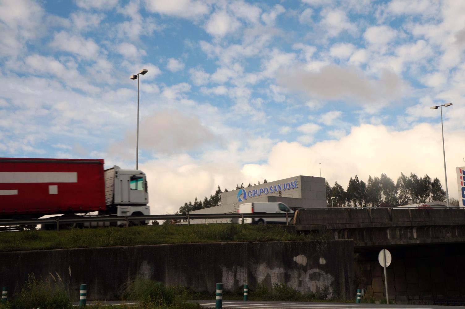 I continue and find the way into a residencial street leading out to N-547, a highway with vehicle-wide shoulder, but which joins the motorway in this direct for a short stretch under a kilometre to the following exit. At this point the cloud closes in and it spits with rain so I stop to put on the rain-jacket. Usually when I put on the rain jacket it stops raining and this time it doesn't fail either, as the rain shortly eases having barely wet the road.