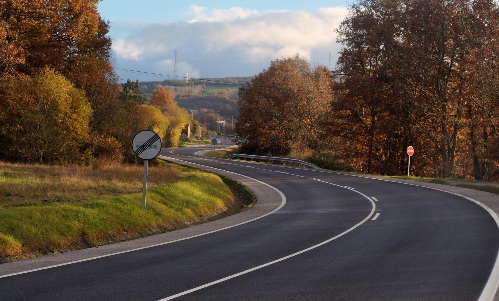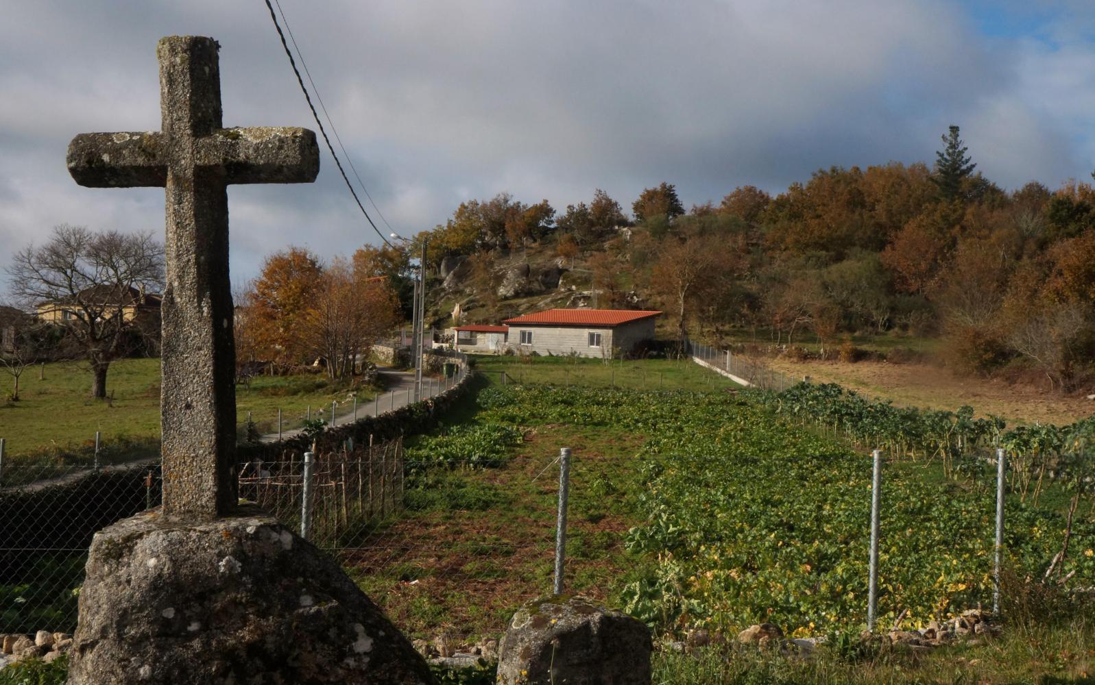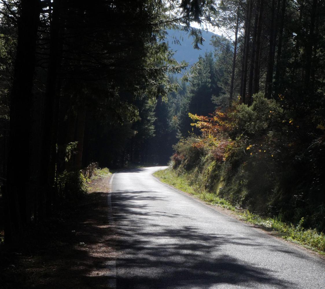 It is a pale bluish-white morning, the road a narrow band of asphalt through rust brown and yellow-leaf deciduous trees with fallen leaves littering the verges. There is only an occasional passing car as the way gradually twists up and around, passing through a few places of no more than a few houses. Its a longer way to Luintra than I thought, but once there, I find a sizable village with cafes, grocery shops and a bank. And a choice of roads spanning out from a small square onwards. There is only one road in the Michelin map, so I'm unsure which road will take me across to the OU536, south of here on the map and going east along the Sil valley.