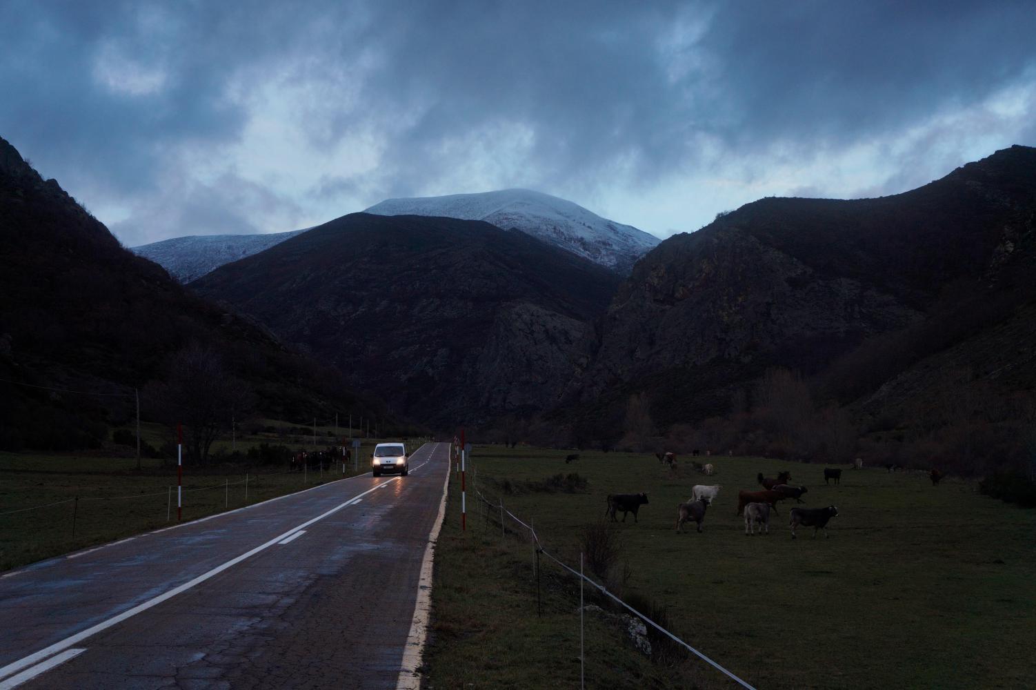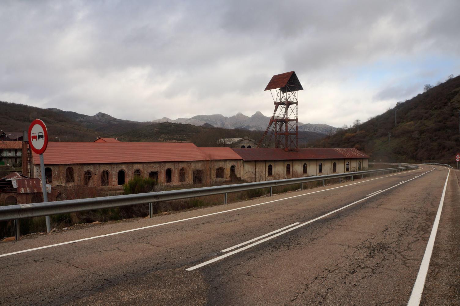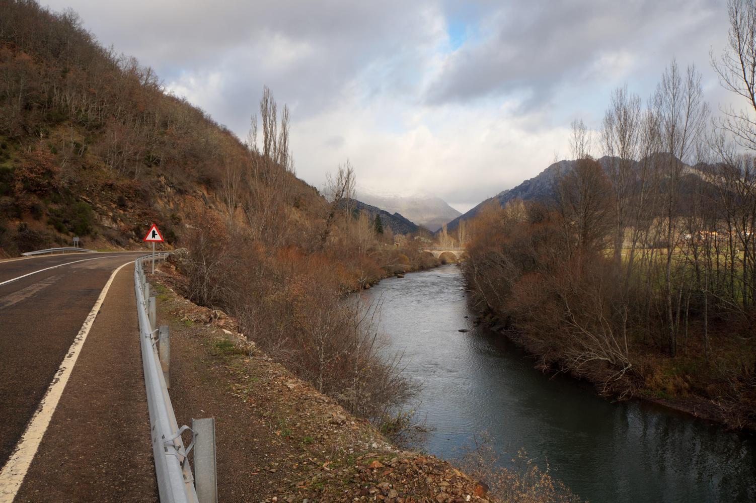 The weather is closing in again and drizzling as I descend towards a second reservoir; which, once down at, I continue across a long suspension bridge over open water in a cutting raw crosswind driving horizontal hail, blowing into me from the left, making it a struggle to ride straight until reaching the far side and the incline up to Riano. On leaving town there's a left-turn, straight on junction: a choice of routes: the straight on option not only is the more direct, also toward clear sky; and, alternatively, turning left is into the horizontal hail, meaning there's no contest in it: I continue straight on.