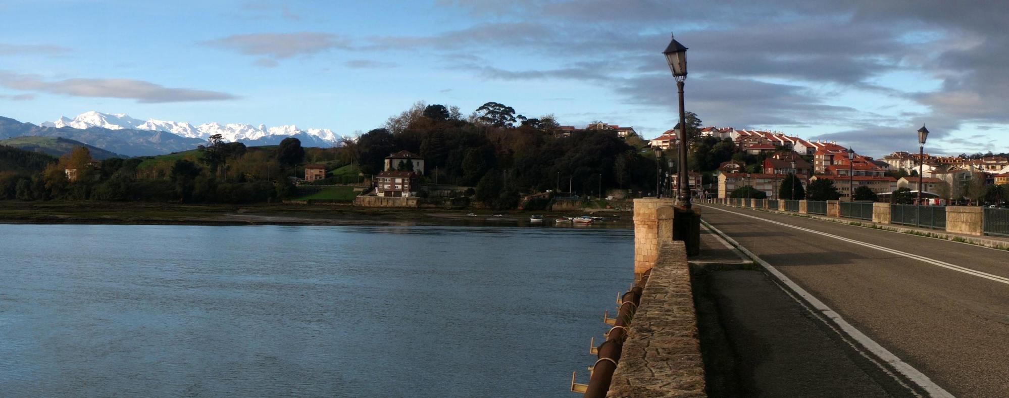 I descend steeply to San Vicente with a busy centre, a boating marina and a long stone bridge across a tidal estuary on the way onwards, where I stop to take a photo. Today with almost cloudless blue sky there's a good view back at the mountains, white with snow. A few others are holding up phones doing likewise.