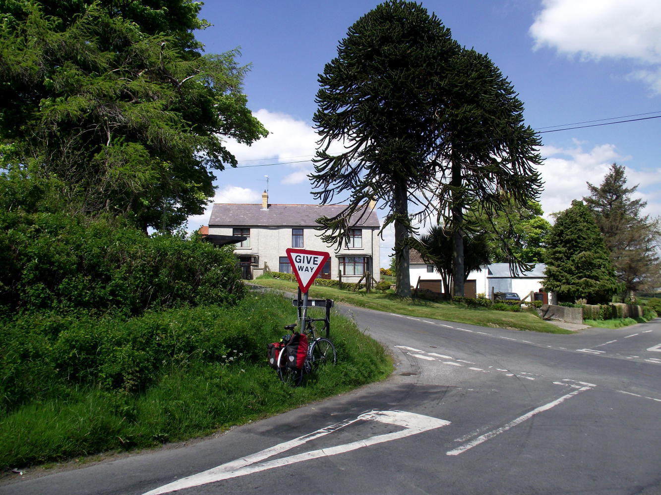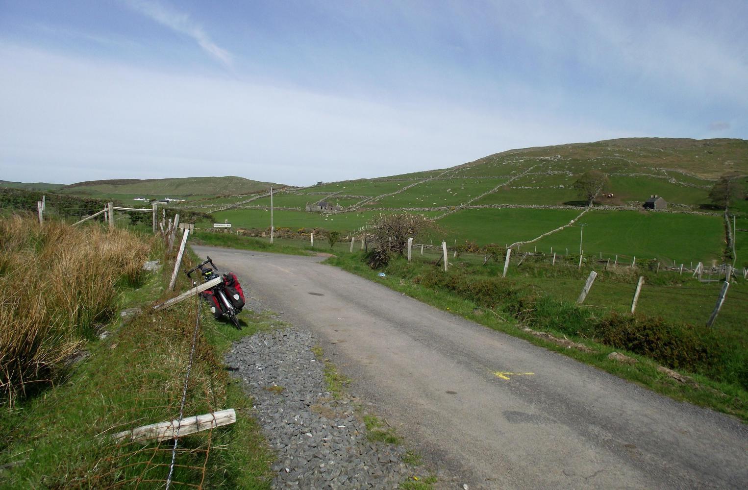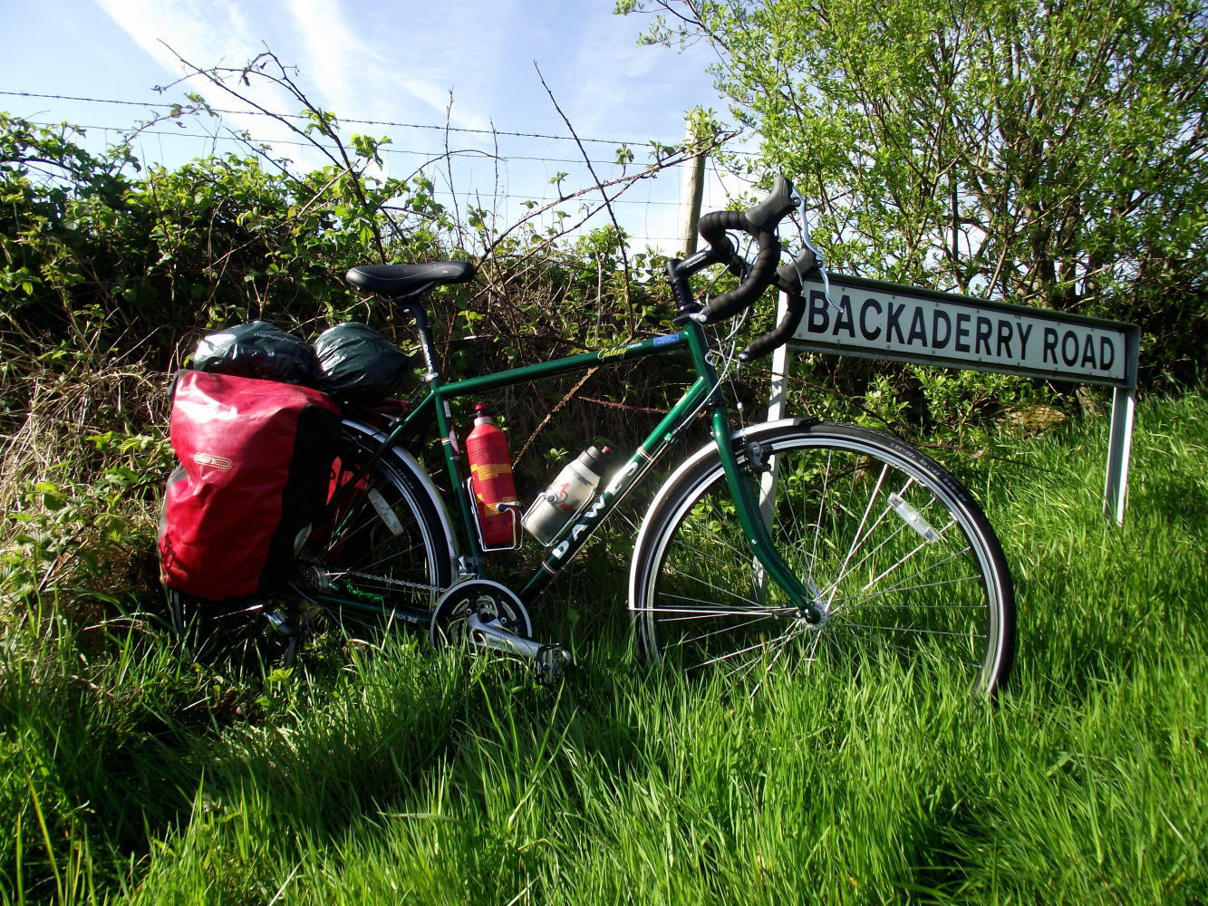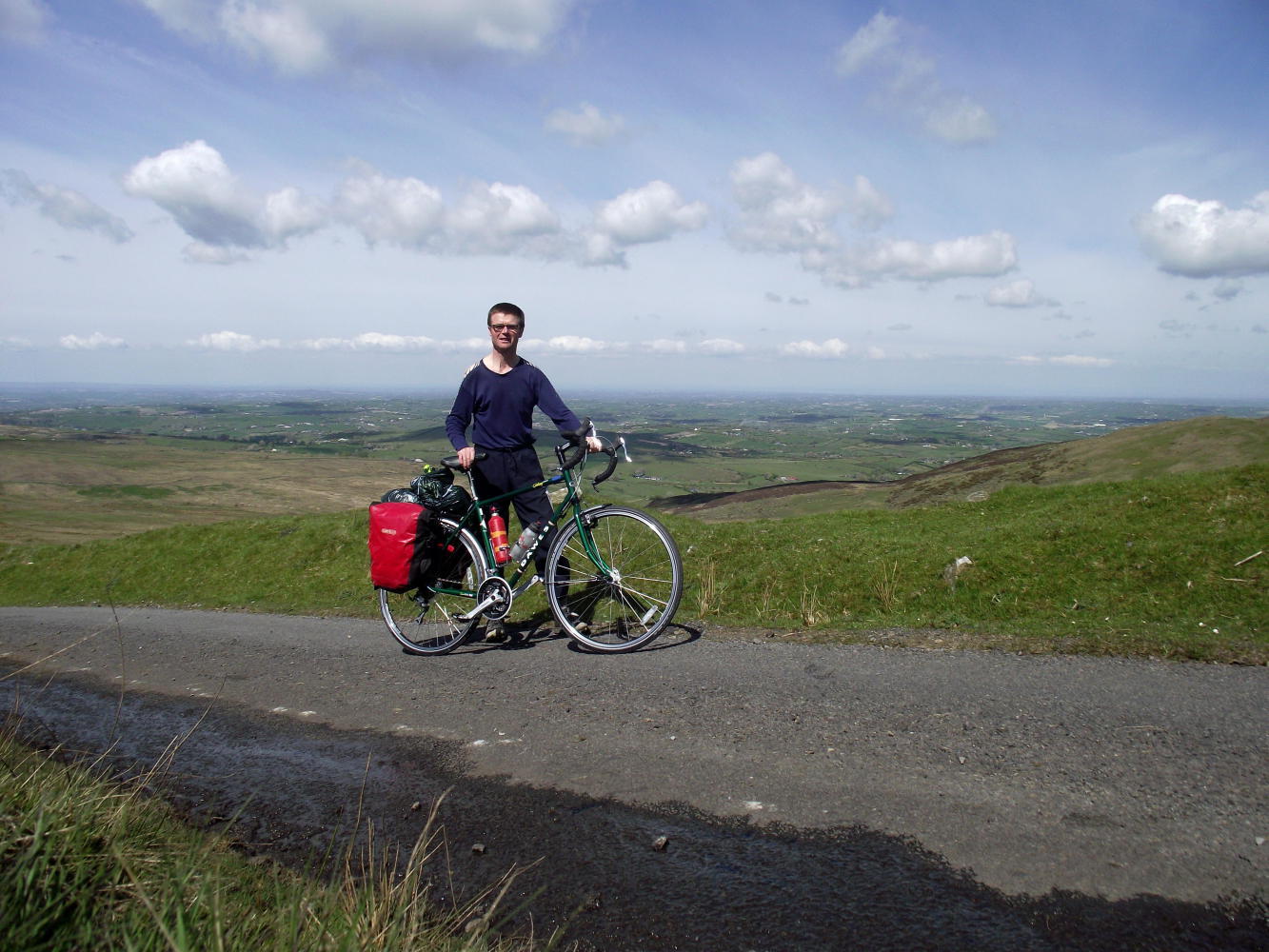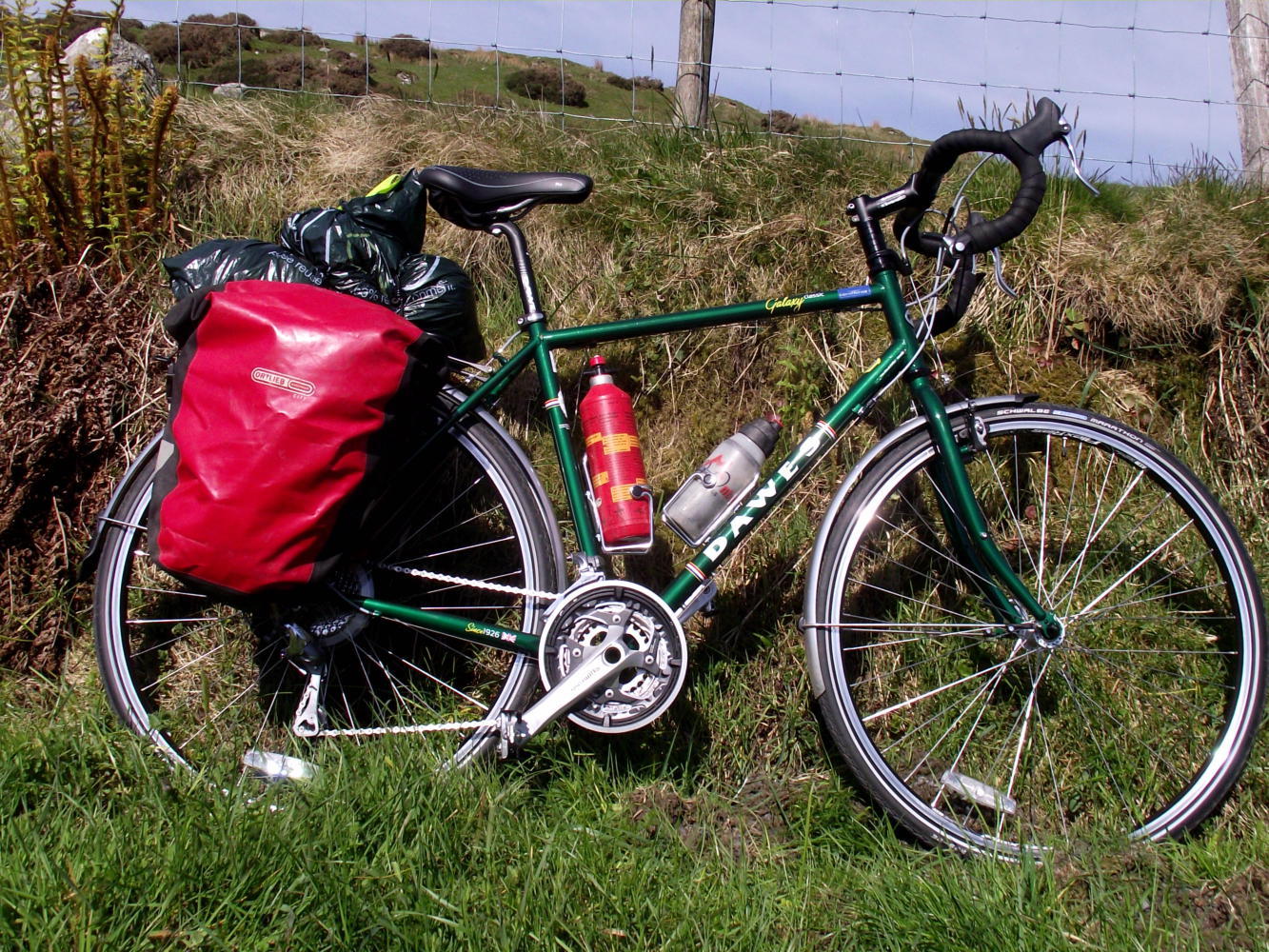 The touring frame geometry together with a generous fork-rake meant I'd confidences descending again. The two rear panniers I loaded up with sleeping-bag, tent and a few other items, in all four kilogrammes a piece, so I'd a bit of weight pushing me downhill. I wonder what the bike'll feel like descending with thirty kilos on the back. Again, having got used to the instant locking effect of vee and disc-brakes, the cantilever brakes take a bit of getting used to. They're a soft stop. Another point is the braking-surface of the rim, I'm hoping it'll be a good many tours before the rim wears down and needs replacing. Of course this isn't an issue with discs.