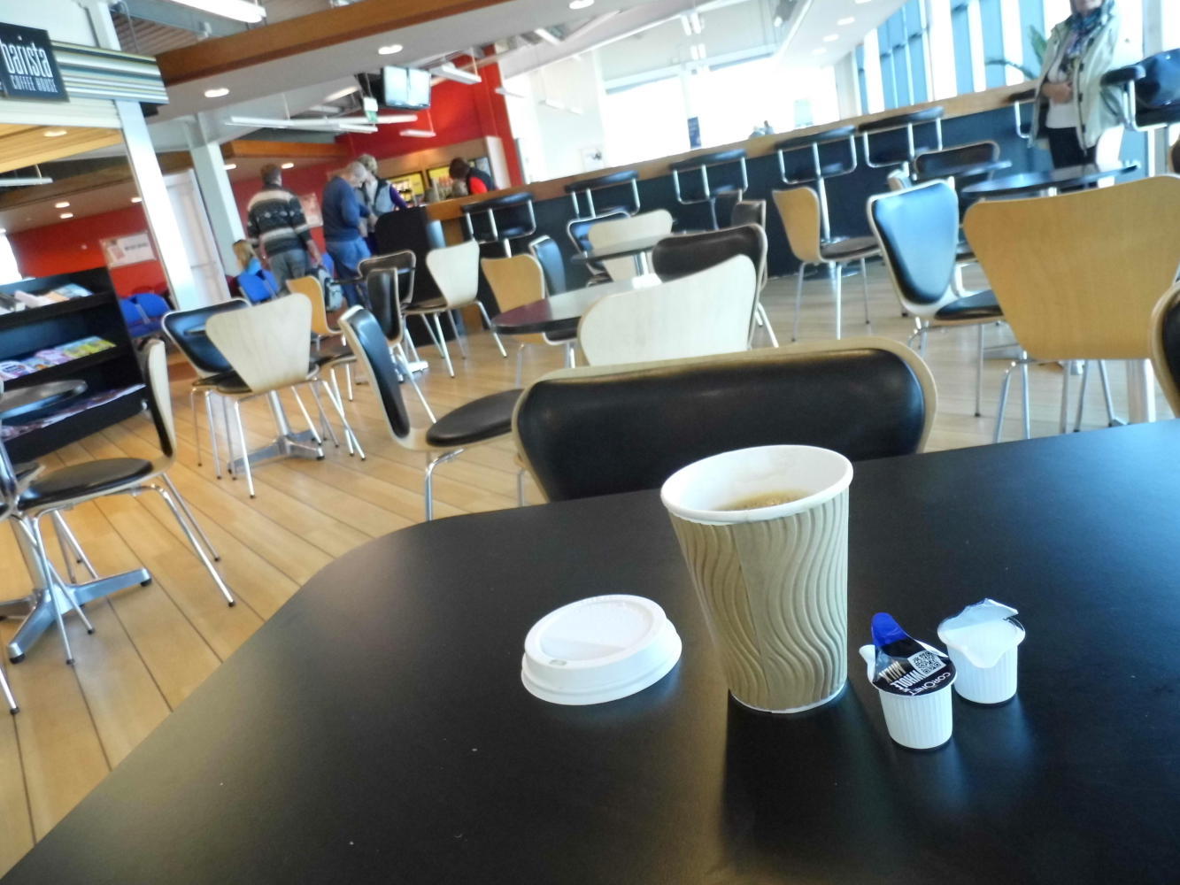 There was a coffee vending machine in the terminal building where I bough a oneway-ticket. I don't much like machine coffee nor soft drinks at one pound seventy in another vending machine, so I resisted the temptation for refreshment until I'd checked in, because I knew there was a cafe in the departure lounge upstairs. But the coffee in the cafe when I'd got that far, tasted like machine coffee; and it cost two-sixty, whereas it only cost a pound downstairs.