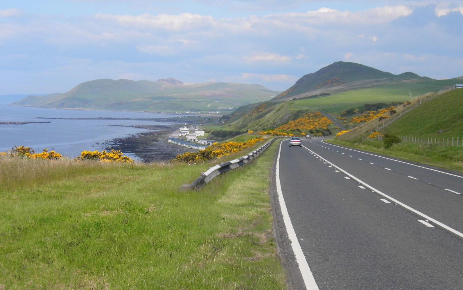 The plan when I rode off the ferry in Cairnryan, was to ride north east following the A77. This is the main road from Ireland bound ports to Glasgow and so a stead flow of arctic-trucks swept past me. And passing at or near the coast, it was ceaselessly up and down over headlands. But it was an extremely scenic route with, Arran Isle and Mull of Kintyre, silhouetted mountains rising on the horizon across the sea on the left.